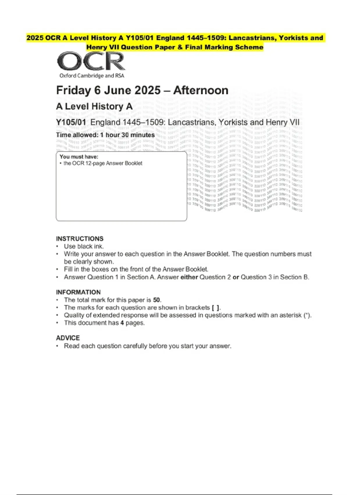 2025 OCR A Level History A Y105/01 England 1445–1509: Lancastrians, Yorkists and Henry VII Question Paper with Final Marking Scheme