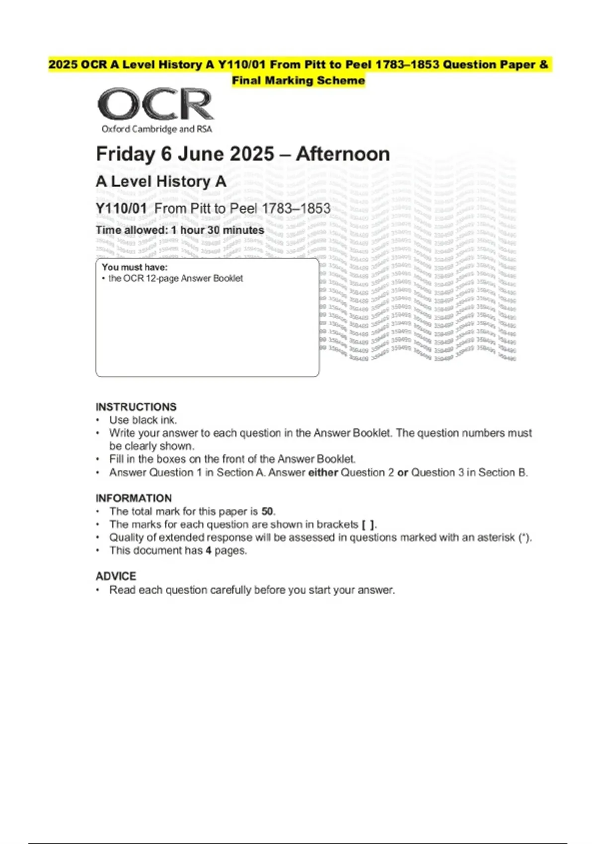 2025 OCR A Level History A Y110/01 From Pitt to Peel 1783–1853 Question Paper with Final Marking Scheme