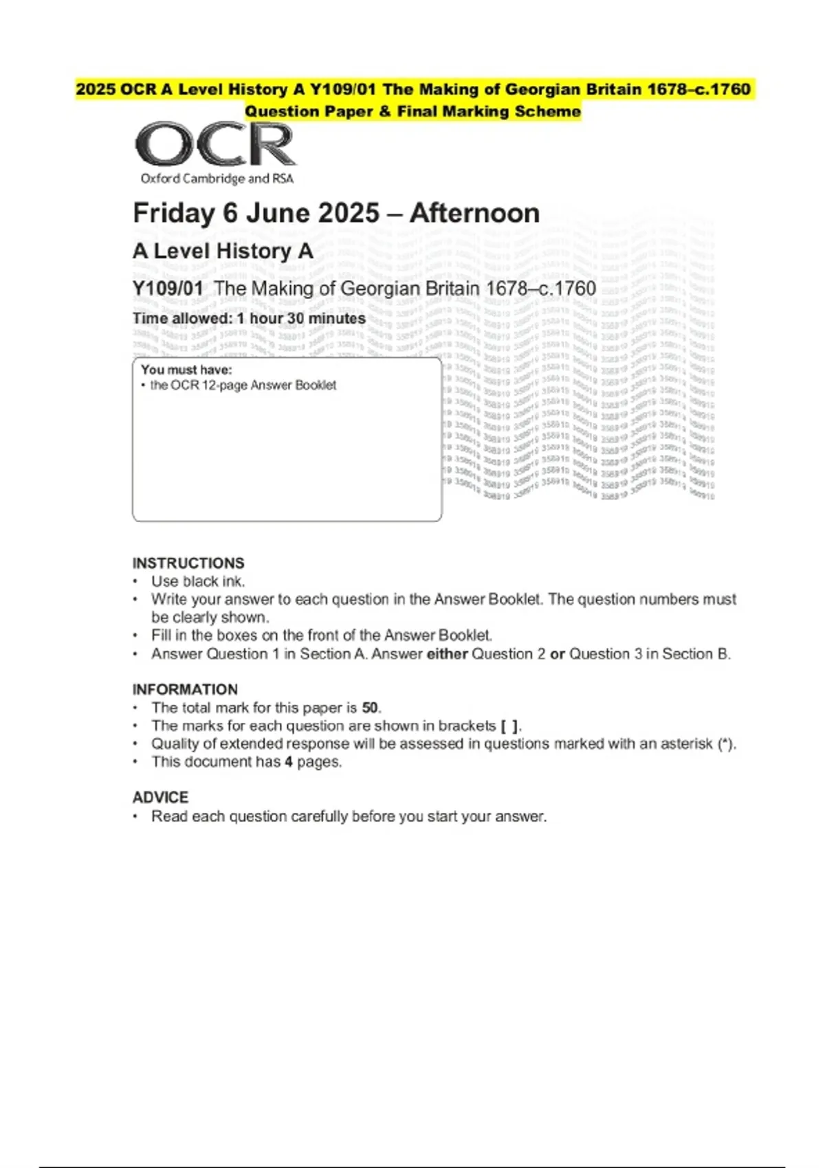 2025 OCR A Level History A Y109/01 The Making of Georgian Britain 1678–c.1760 Question Paper with Final Marking Scheme