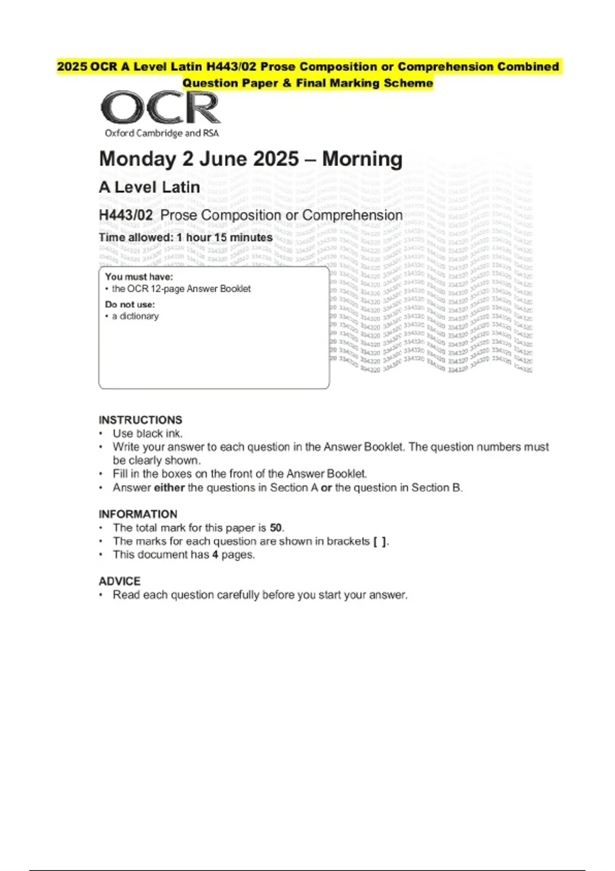 2025 OCR A Level Latin H443/02 Prose Composition or Comprehension Question Paper with Final Marking Scheme