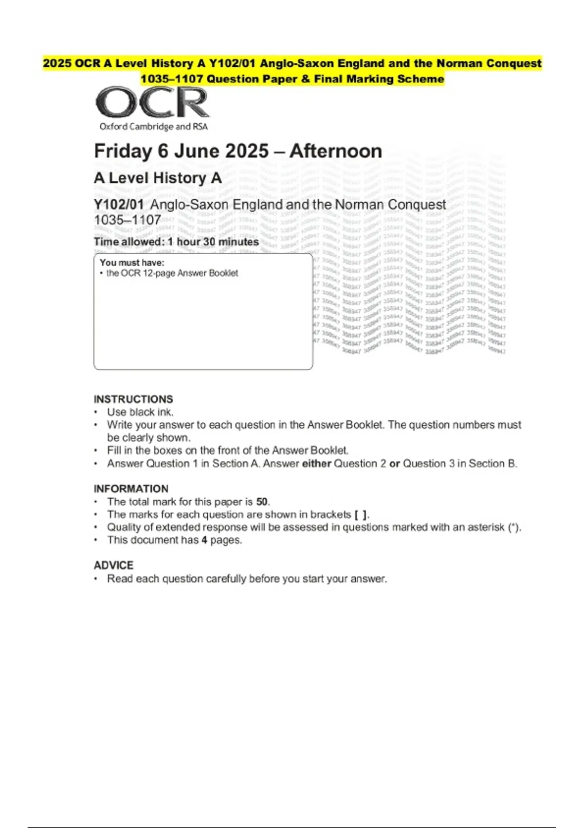 2025 OCR A Level History A Y102/01 Anglo-Saxon England and the Norman Conquest 1035–1107 Question Paper with Final Marking Scheme