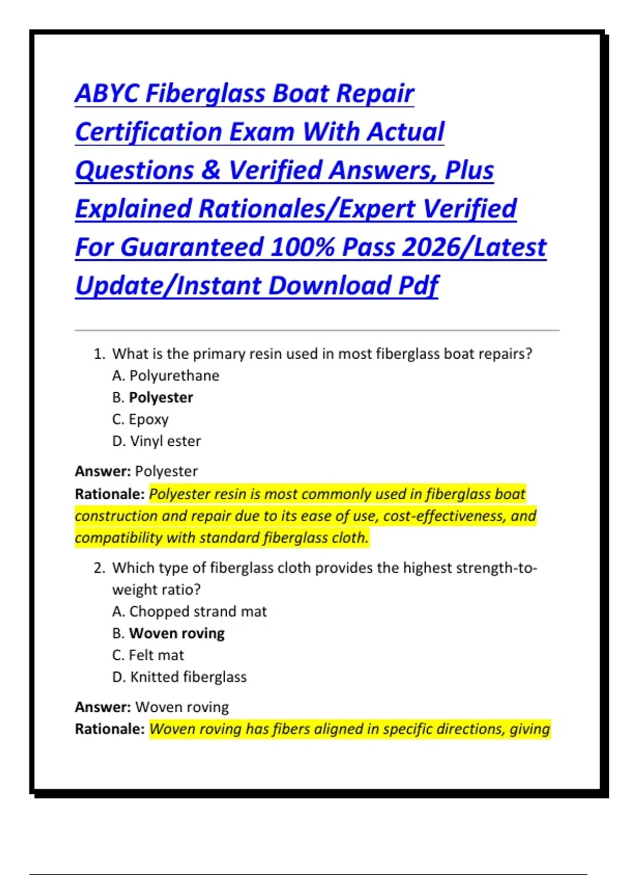 ABYC Fiberglass Boat Repair Certification Exam With Actual Questions & Verified Answers, Plus Explained Rationales/Expert Verified For Guaranteed 100% Pass 2026/Latest Update/Instant Download Pdf