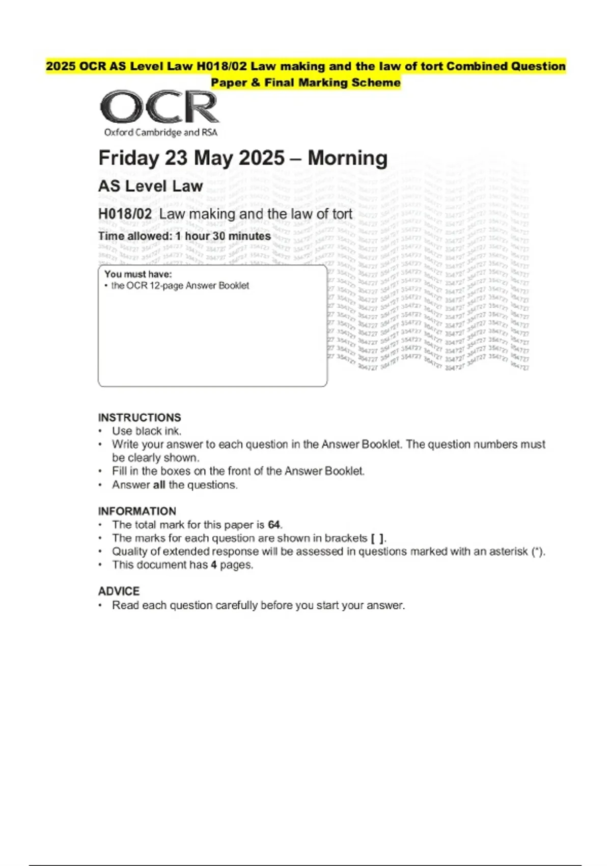 2025 OCR AS Level Law H018/02 Law making and the law of tort Question Paper with Final Marking Scheme