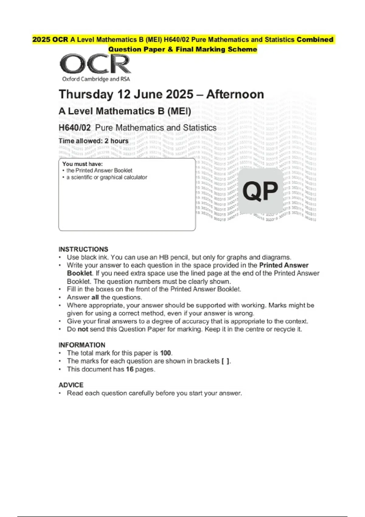 2025 OCR A Level Mathematics B (MEI) H640/02 Pure Mathematics and Statistics Question Paper with Final Marking Scheme