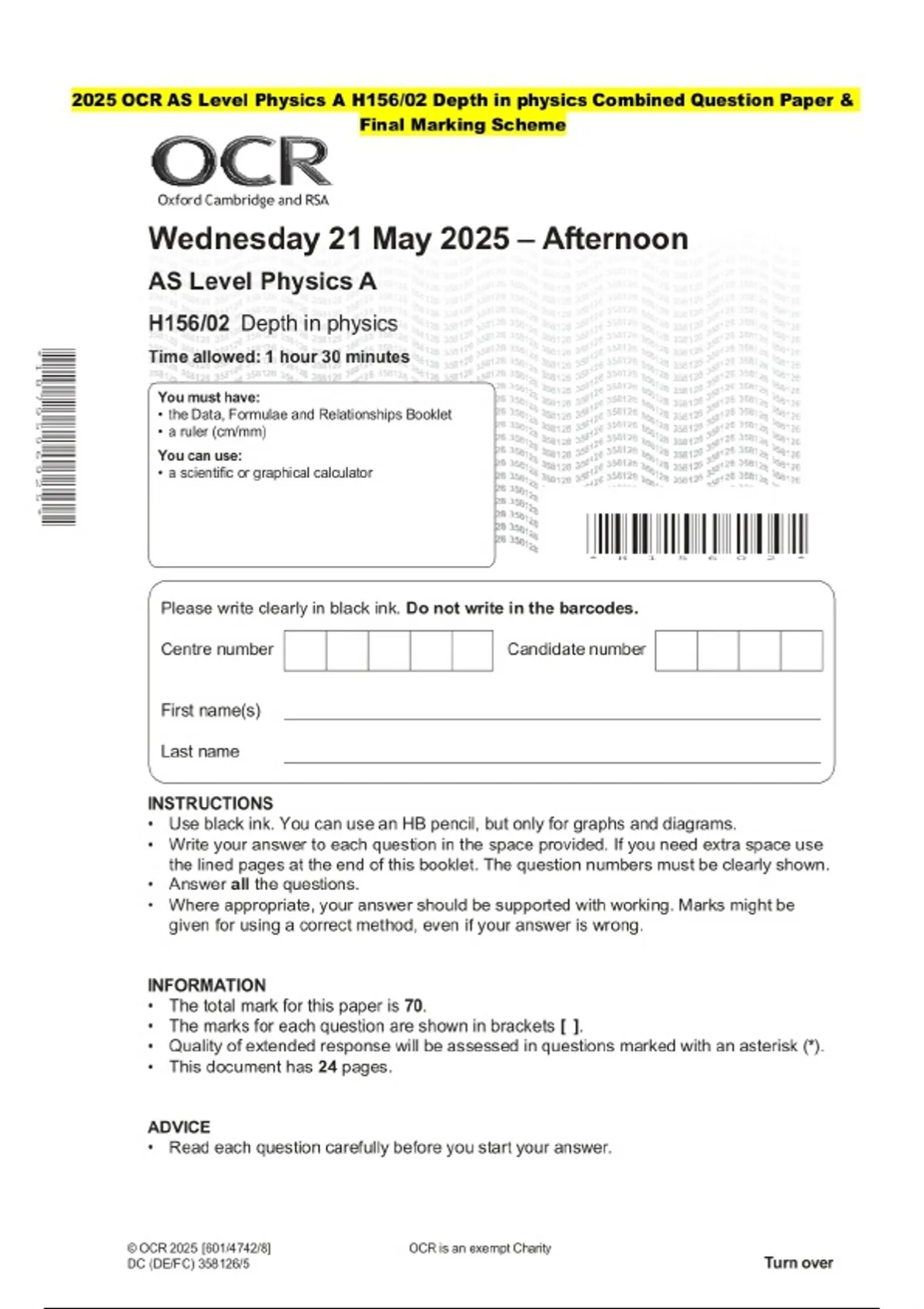 2025 OCR AS Level Physics A H156/02 Depth in physics Question Paper with Final Marking Scheme
