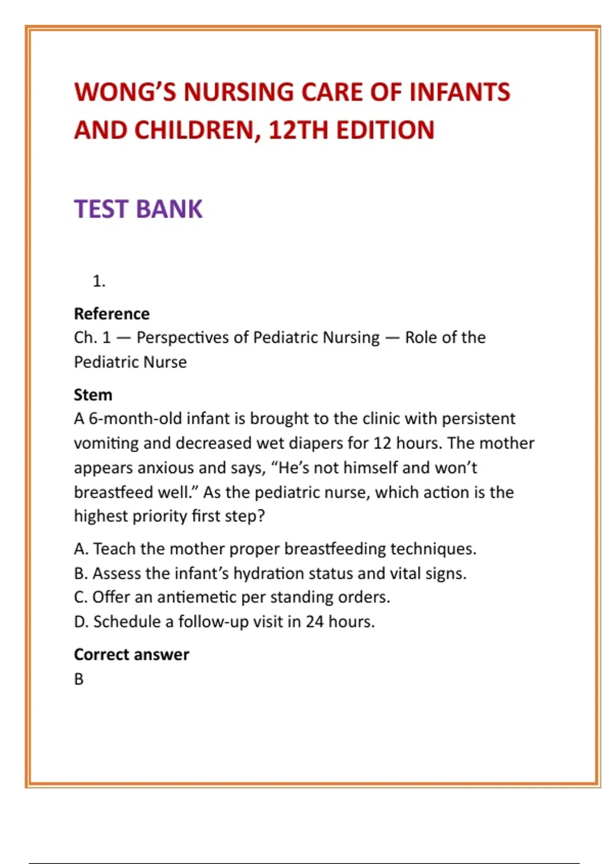 Assessing hydration and vital signs determines the infant’s