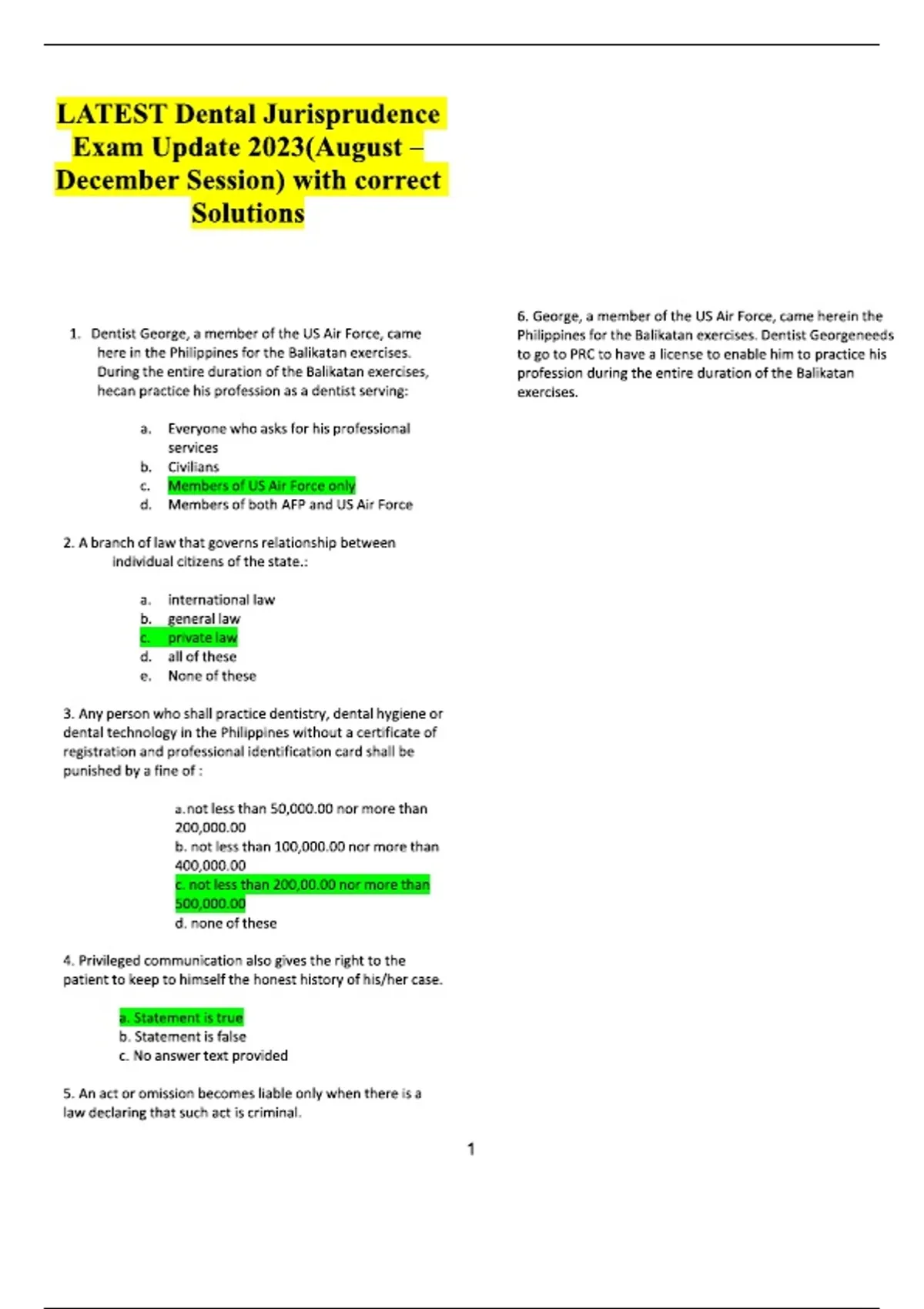 Prepare and excel in the Dental Jurisprudence Exam with this comprehensive guide featuring verified questions, correct answers, and detailed rationales. Fully updated for 2026/2027, this resource helps dental professionals review key laws, regulations, and licensing requirements to boost exam confidence and achieve top scores. Perfect for focused study and dental licensure success.