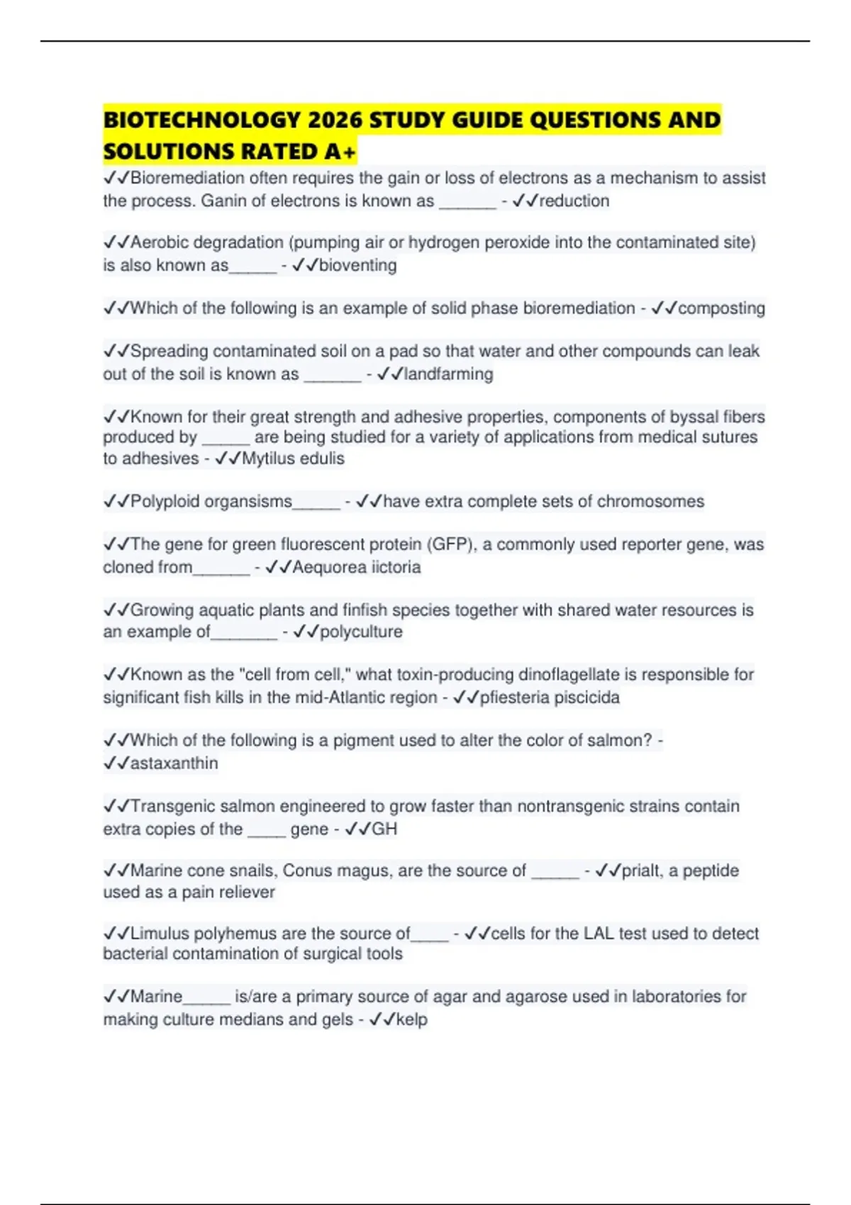 ✔✔Which of the following is an example of solid phase bioremediation - ✔✔composting