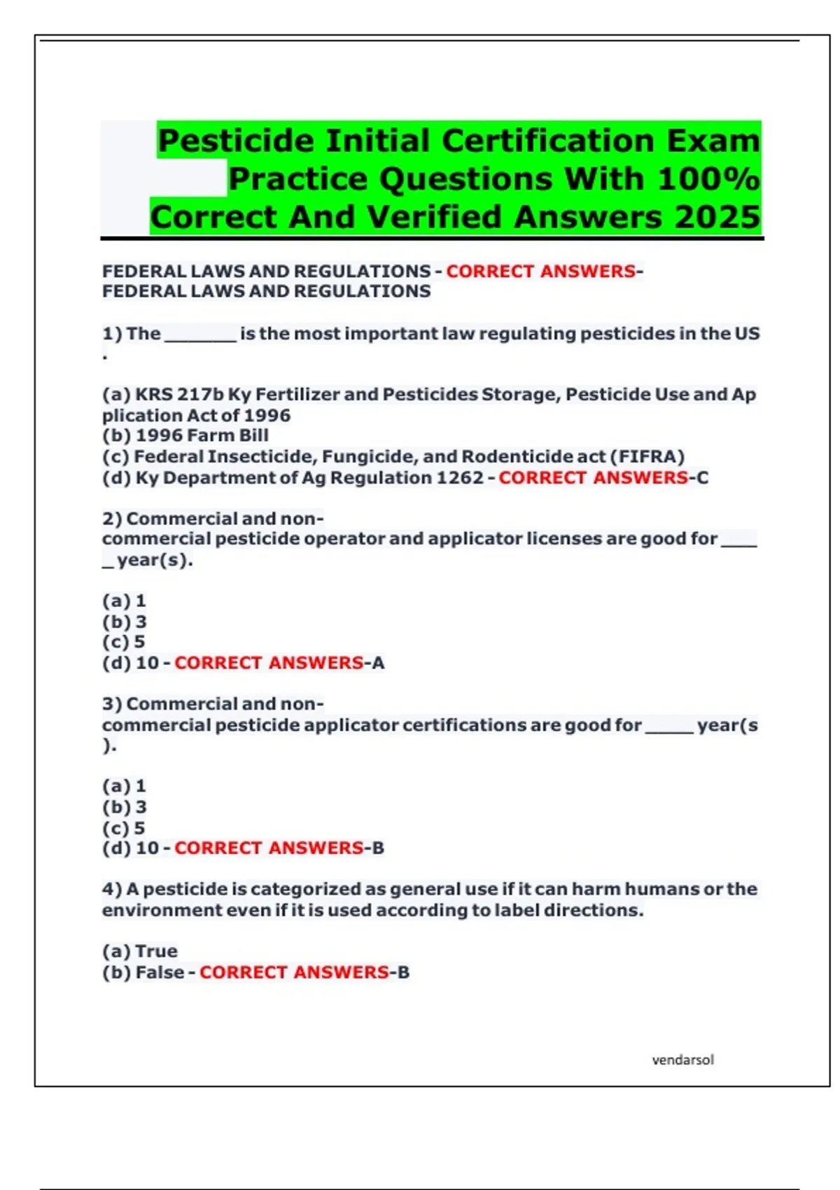 The Pesticide Initial Certification Exam Practice Questions 2025 resource provides accurate, exam-style questions with 100% correct verified answers. Covering pesticide laws and regulations, safety and PPE, environmental protection, integrated pest management, label comprehension, application techniques, and hazard prevention, this study guide strengthens exam readiness and supports successful completion of state pesticide applicator certification examinations.