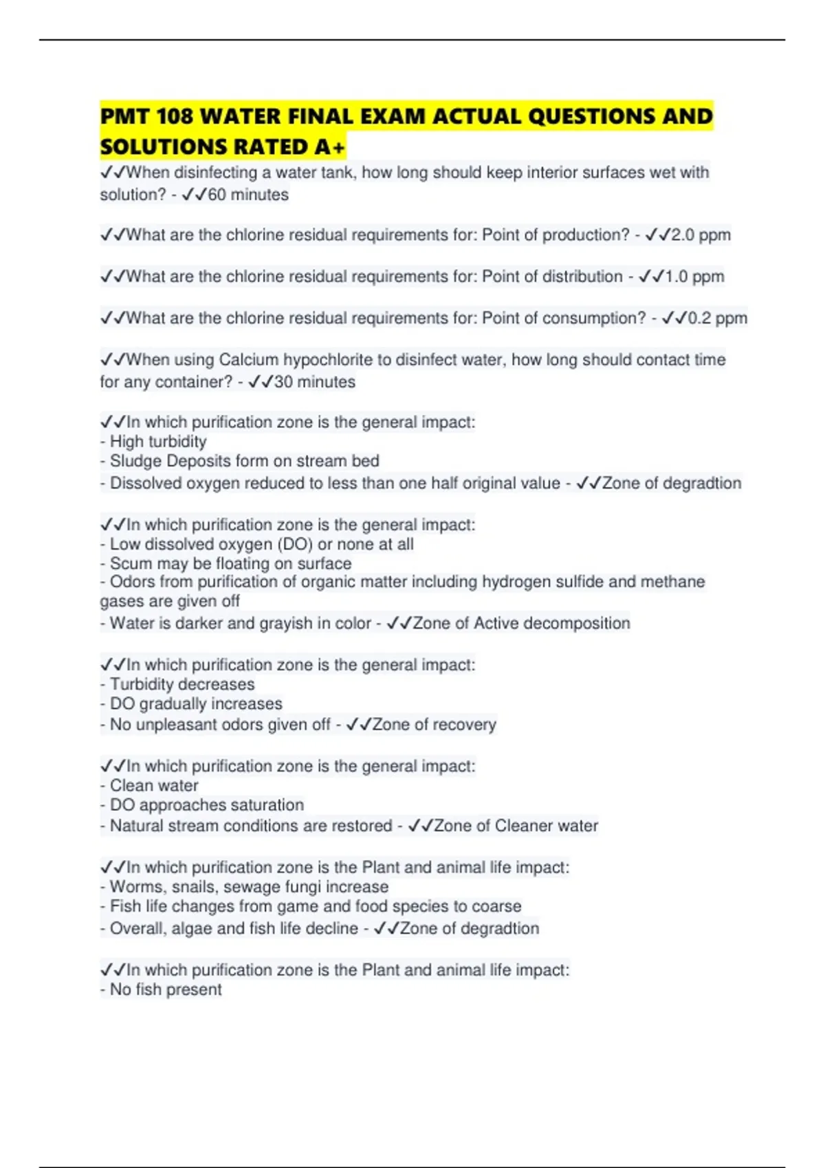 PMT 108 WATER FINAL EXAM ACTUAL QUESTIONS AND SOLUTIONS RATED A+