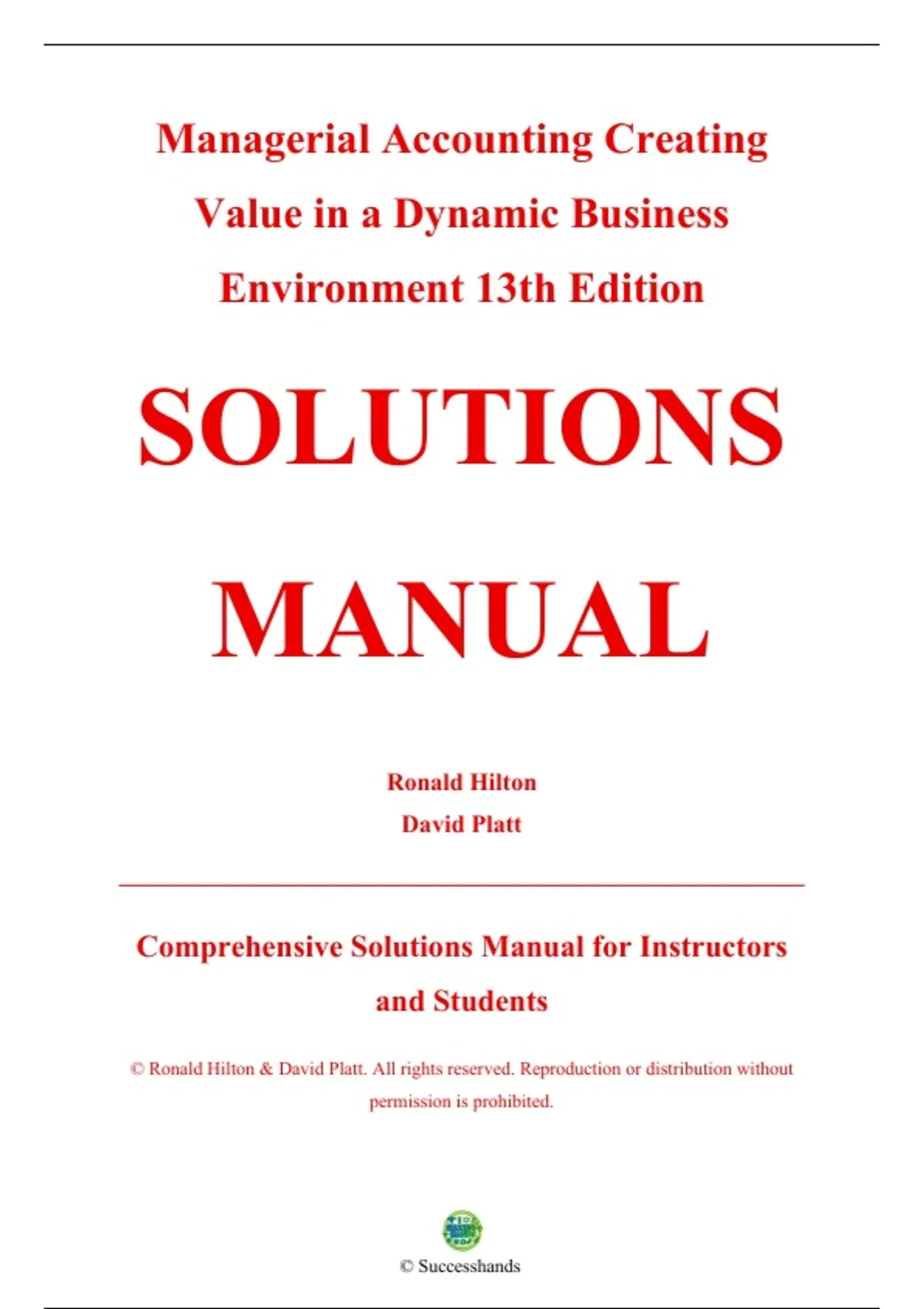 Complete Solutions Manual — Managerial Accounting: Creating Value in a Dynamic Business Environment, 13th Edition — Ronald W. Hilton — ISBN 9781264100699 — (All Chapters Covered 1–17, Solutions Included). Chapters included: Chapter 1 The Changing Role of Managerial Accounting in a Dynamic Business Environment, Chapter 2 Basic Cost Management Concepts, Chapter 3 Product Costing and Cost Accumulation in a Batch Production Environment, Chapter 4 Process Costing and Hybrid Product-Costing Systems, Chapter 5 Activity-Based Costing and Management, Chapter 6 Activity Analysis, Cost Behavior, and Cost Estimation, Chapter 7 Cost-Volume-Profit Analysis, Chapter 8 Variable Costing and the Measurement of ESG and Quality Costs, Chapter 9 Financial Planning and Analysis: The Master Budget, Chapter 10 Standard Costing and Analysis of Direct Costs, Chapter 11 Flexible Budgeting and the Management of Overhead and Support Activity Costs, Chapter 12 Responsibility Accounting and the Balanced Scorecard, Chapter 13 Investment Centers and Transfer Pricing, Chapter 14 Decision Making: Relevant Costs and Benefits, Chapter 15 Target Costing and Cost Analysis for Pricing Decisions, Chapter 16 Capital Expenditure Decisions, Chapter 17 Allocation of Support Activity Costs and Joint Costs.