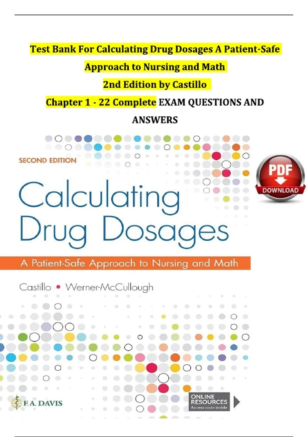 This is the complete Test Bank for Calculating Drug Dosages: A Patient-Safe Approach to Nursing and Math, 2nd Edition by Sandra Luz Martinez de Castillo, covering Chapters 1–22. It includes multiple-choice, true/false, and calculation-based questions with verified answers, designed to help students master safe and accurate medication dosage calculations. Perfect for nursing students and educators, this resource supports learning in pharmacology, dosage calculation, and safe drug administration, making it ideal for preparing for quizzes, exams, and clinical practice.Test Bank