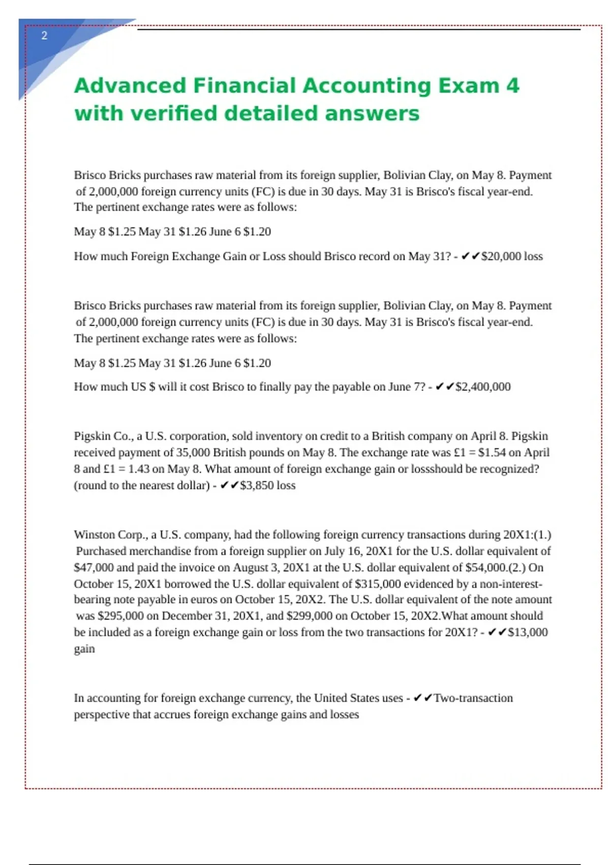 exchange gains and losses is true? - ✔✔For an export sale, a gain results when foreign currency
