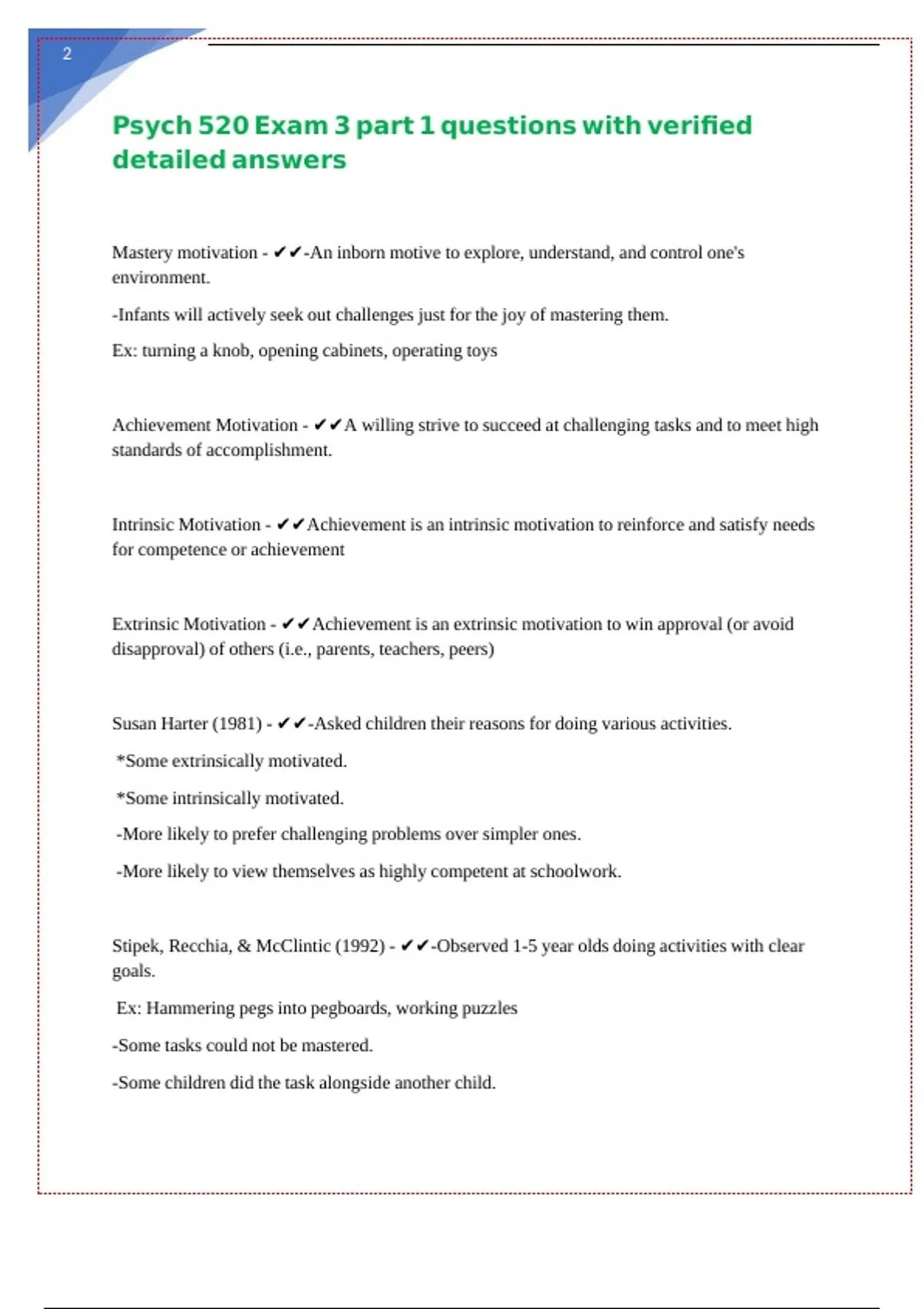 Extrinsic Motivation - ✔✔Achievement is an extrinsic motivation to win approval (or avoid