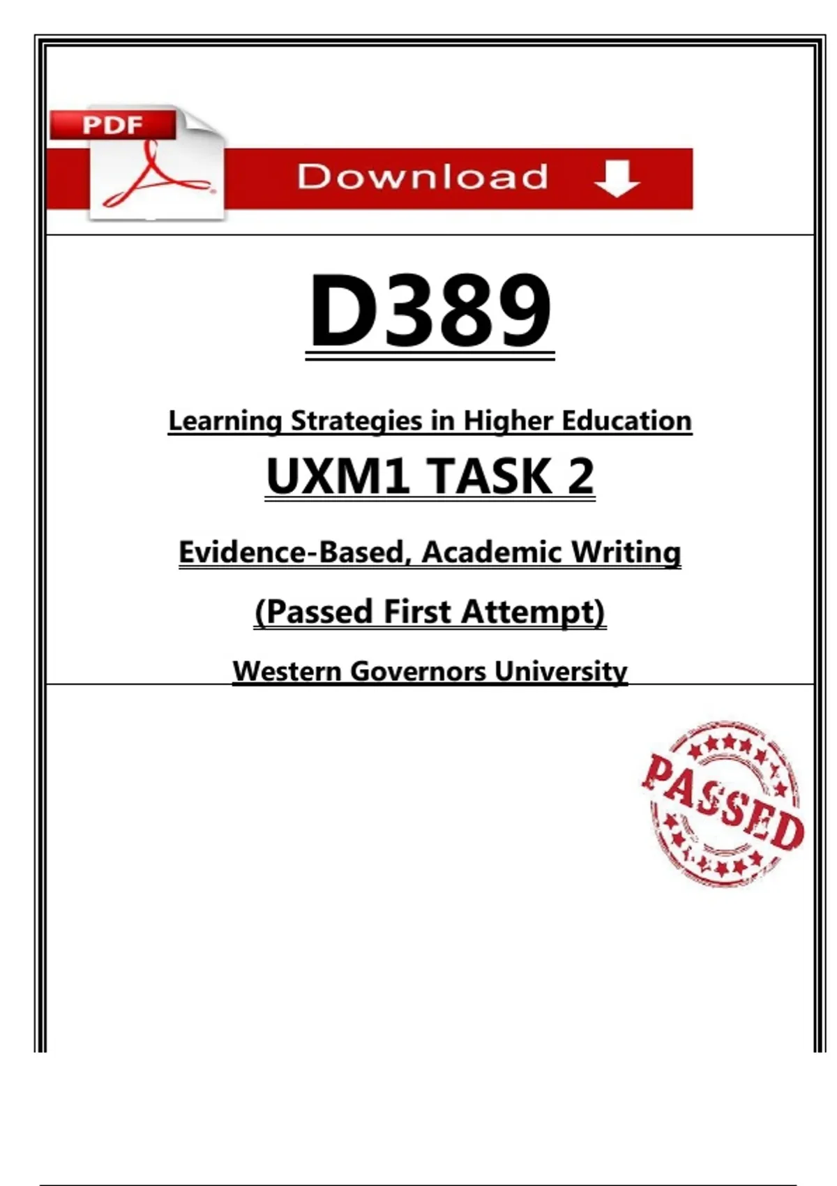 INSTANT PDF DOWNLOAD. This WGU D389 UXM1 Task 2 is a verified passed submission (first attempt) for Learning Strategies in Higher Education. The paper demonstrates evidence-based academic writing, strong synthesis of peer-reviewed sources, proper APA formatting, and alignment with the official WGU rubric. Ideal as a high-quality reference for students completing D389 in the 2026 academic year. WGU D389 UXM1 Task 2, D389 Task 2 Passed, WGU UXM1 Evidence Based Writing, D389 Academic Writing, WGU D389 Template, D389 First Attempt Pass, WGU Learning Strategies Paper, D389 Evidence Based Paper, WGU Education Task, D389 Task 2 Example, WGU D389 2026, UXM1 Academic Writing, WGU APA Writing, D389 Sample Paper, WGU Performance Assessment, D389 Higher Education, WGU D389 Submission, UXM1 Task 2 PDF, WGU Education Degree, D389 Study Guide, WGU D389 Help
