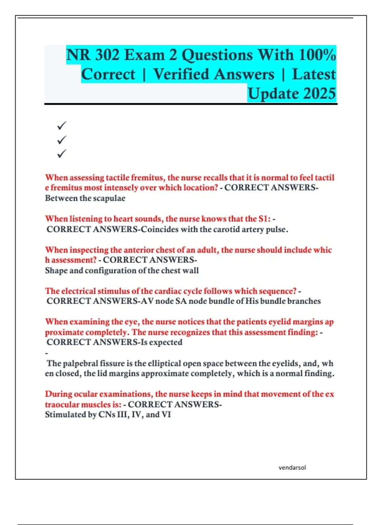The NR 302 Exam 2 Questions resource offers 100% correct verified answers with latest 2025 updates for health assessment. Featuring accurate exam-style questions, detailed rationales, and explanations, it's designed for effective NR 302 Exam 2 prep, study guide support, and confident performance. Trusted by nursing students, it ensures comprehensive practice across NR302 topics for classroom and exam success in 2025.