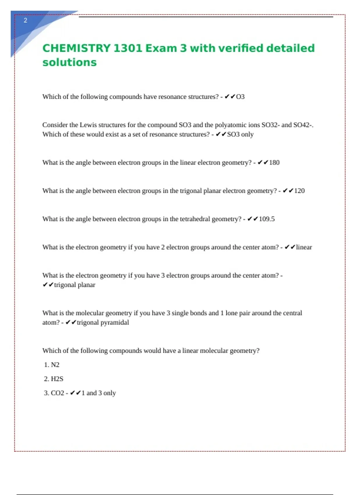CHEMISTRY 1301 Exam 3 with verified detailed || || || || || || ||