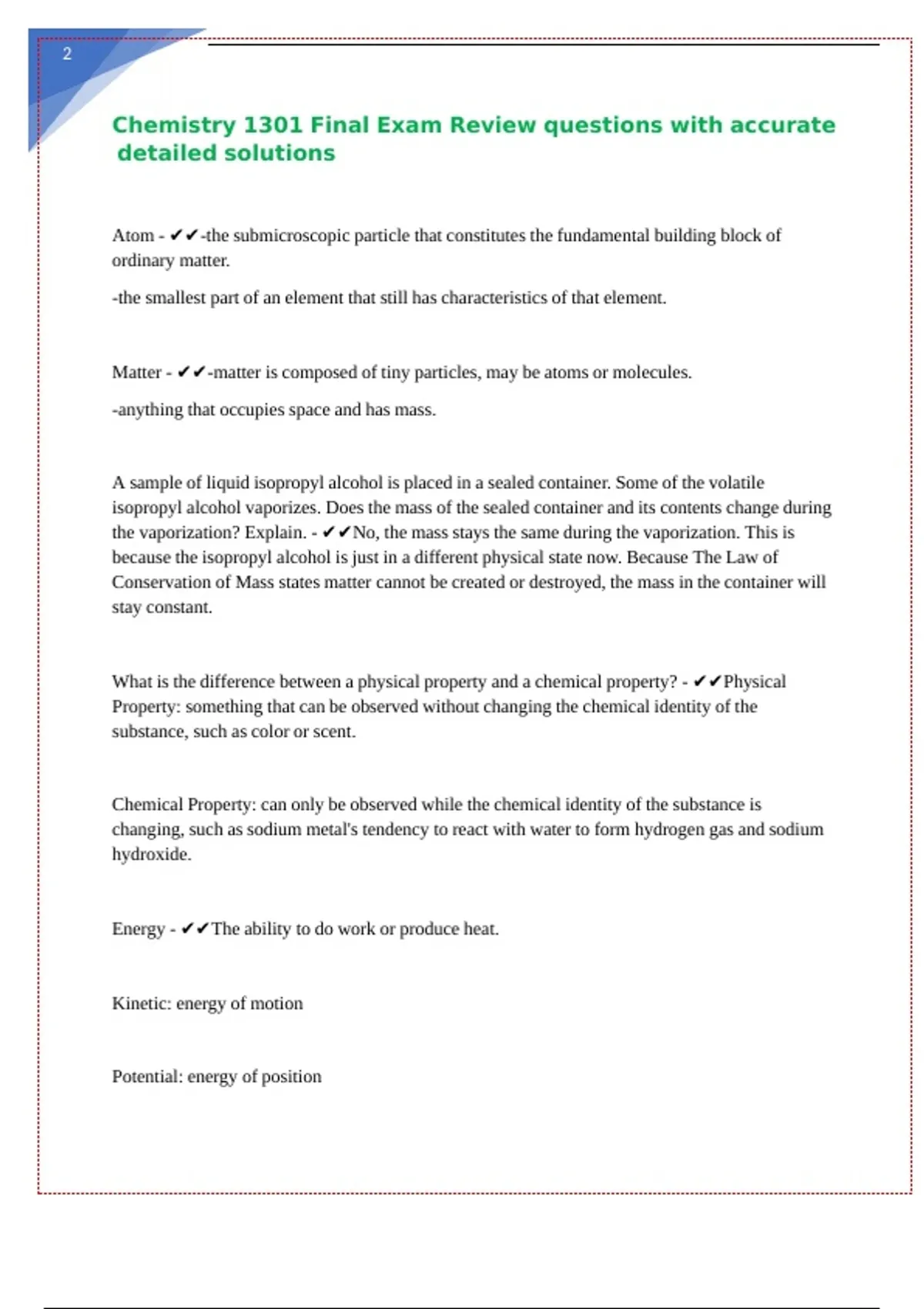 Chemistry 1301 Final Exam Review questions with accurate || || || || || || ||