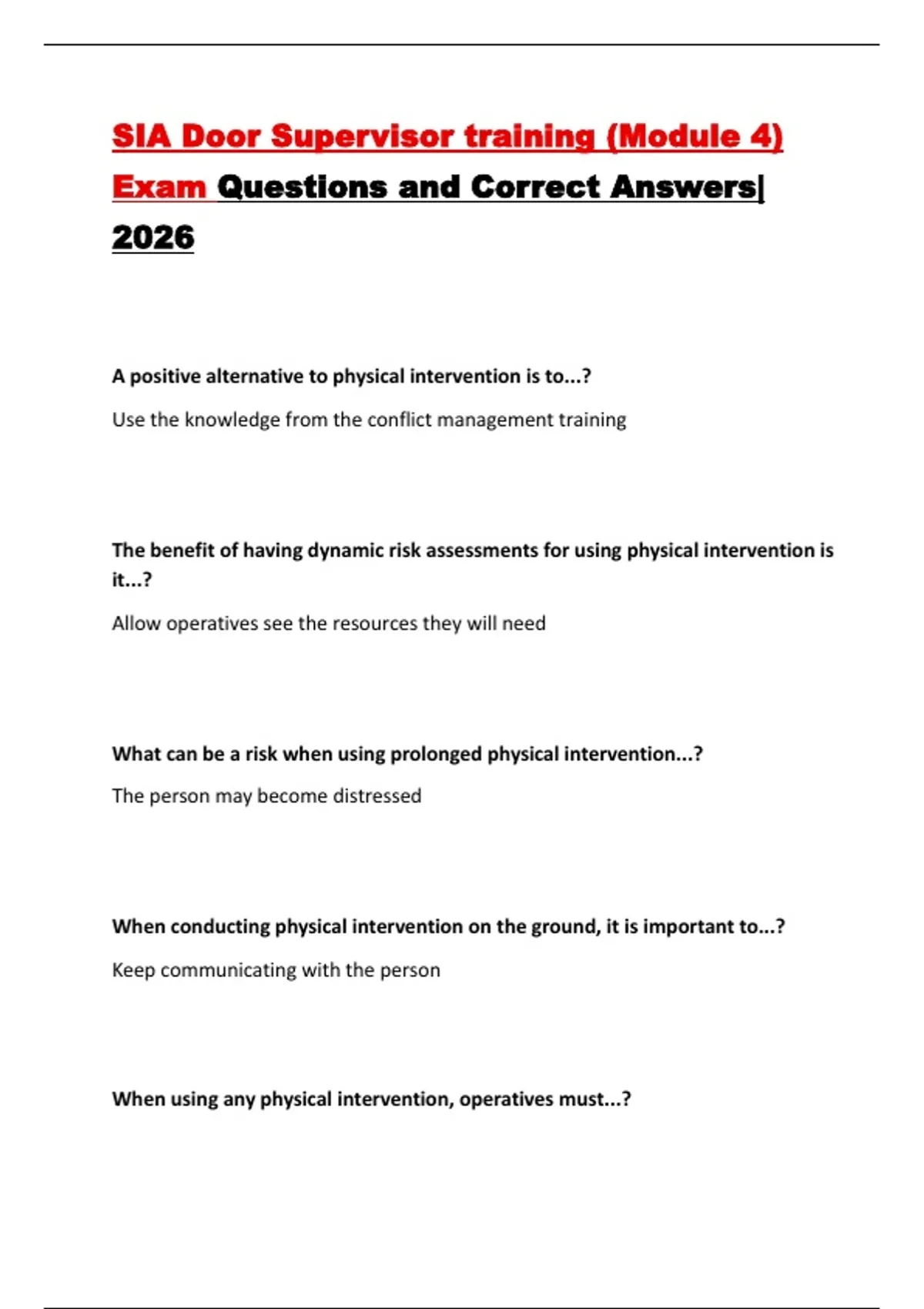 This document is the updated SIA Door Supervisor Training Module 4 exam study guide focusing on physical intervention, conflict management, and duty of care requirements set by the Security Industry Authority (SIA). It contains exam questions with correct answers covering key topics such as dynamic risk assessment, proportional use of force, positional asphyxia, acute behavioural disturbance (ABD), psychosis indicators, communication during restraint, ground restraint risks, legal responsibilities, and post-incident procedures. The material is designed to support effective preparation for the SIA Door Supervisor exam by reinforcing safety-first practices, legal compliance, and professional responsibilities when using physical intervention. It is ideal for learners completing SIA Door Supervisor training and preparing for assessment or refresher certification.