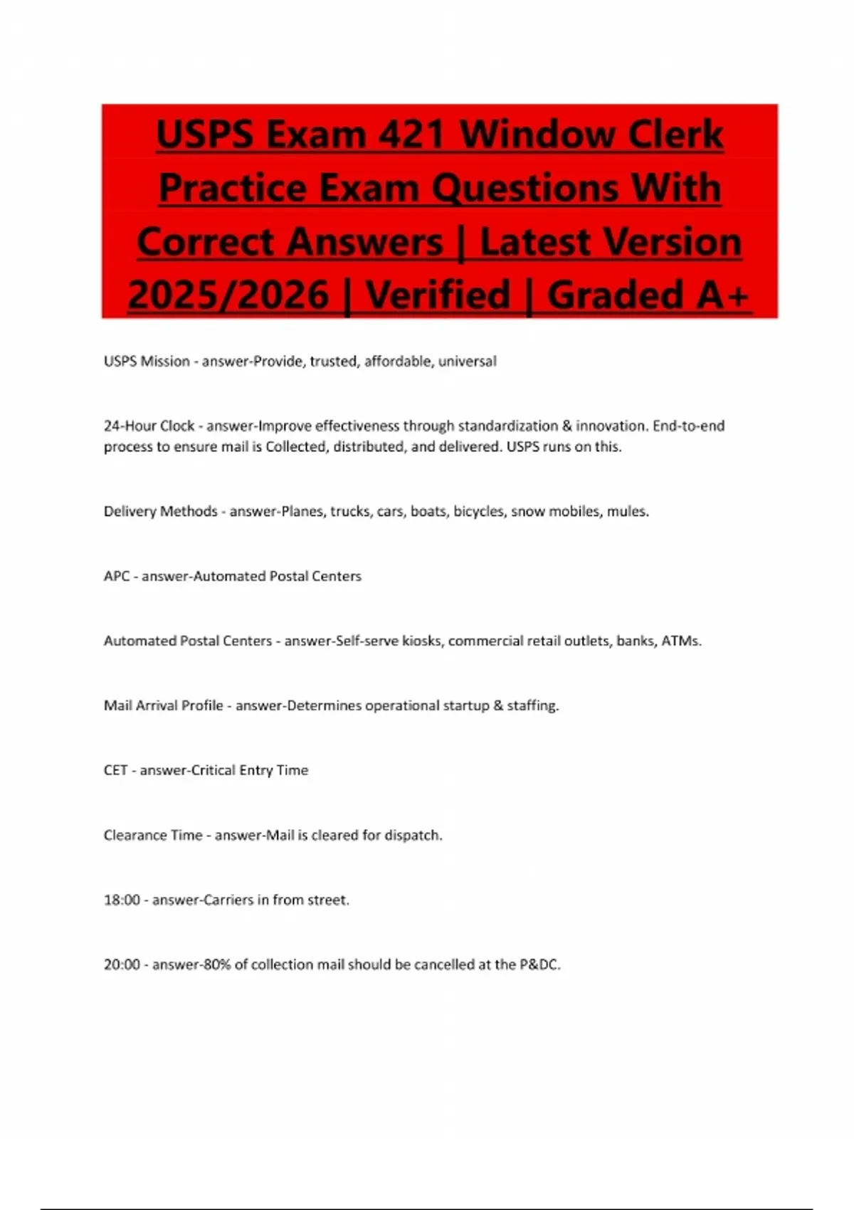 USPS Exam 421 Window Clerk Practice Exam Questions With Correct Answers | Latest Version 2025/2026 | Verified | Graded A+ USPS Mission - answer-Provide, trusted, affordable, universal 24-Hour Clock - answer-Improve effectiveness through standardization & innovation. End-to-end process to ensure mail is Collected, distributed, and delivered. USPS runs on this. Delivery Methods - answer-Planes, trucks, cars, boats, bicycles, snow mobiles, mules. APC - answer-Automated Postal Centers Automated Postal Centers - answer-Self-serve kiosks, commercial retail outlets, banks, ATMs. Mail Arrival Profile - answer-Determines operational startup & staffing. CET - answer-Critical Entry Time Clearance Time - answer-Mail is cleared for dispatch. 18:00 - answer-Carriers in from street. 20:00 - answer-80% of collection mail should be cancelled at the P&DC.23:00 - answer-Out of primary processing. 24:00 - answer-Secondary Operations Complete 04:00-09:00 - answer-Distribute to DDC/DDU 07:00 - answer-100% of DPS 2nd pass complete. Core Responsibility - answer-Security, Sanctity, Preserve, Protect - Instills customer confidence, projects positive public image, maintains competitive advantage, protects privacy. PolicyNet - answer-Online resource to find handbooks, manuals, publications.