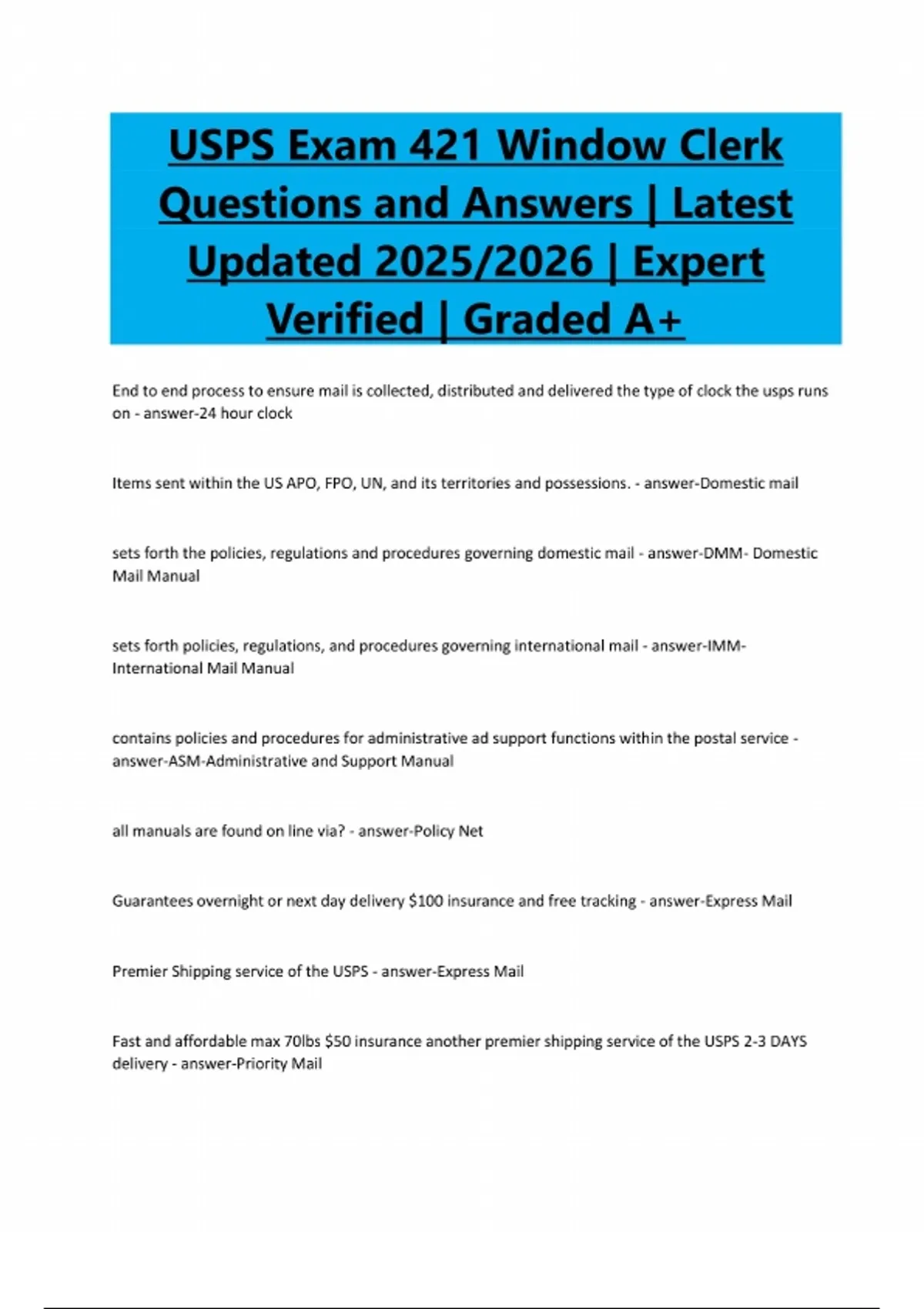 USPS Exam 421 Window Clerk Questions and Answers | Latest Updated 2025/2026 | Expert Verified | Graded A+ End to end process to ensure mail is collected, distributed and delivered the type of clock the usps runs on - answer-24 hour clock Items sent within the US APO, FPO, UN, and its territories and possessions. - answer-Domestic mail sets forth the policies, regulations and procedures governing domestic mail - answer-DMM- Domestic Mail Manual sets forth policies, regulations, and procedures governing international mail - answer-IMMInternational Mail Manual contains policies and procedures for administrative ad support functions within the postal service - answer-ASM-Administrative and Support Manual all manuals are found on line via? - answer-Policy Net Guarantees overnight or next day delivery $100 insurance and free tracking - answer-Express Mail Premier Shipping service of the USPS - answer-Express Mail Fast and affordable max 70lbs $50 insurance another premier shipping service of the USPS 2-3 DAYS delivery - answer-Priority MailBulk mail usually handled at distribution centers - answer-Parcel Select Merchant pays postal fee returning merchandise bulk parcel return product - answer-Parcel Return Services First class mail, periodicals, standard mail, package services - answer-Mailing services proof of mailing uses PS Form 3800 - answer-Certified Mail