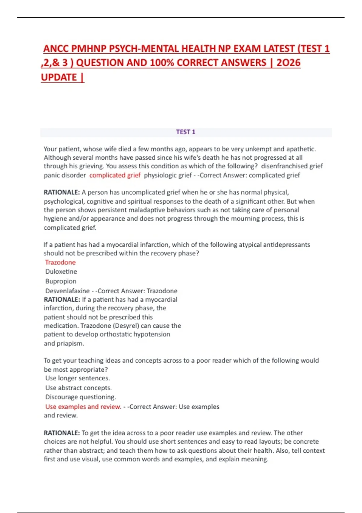 ANCC PMHNP PSYCH-MENTAL HEALTH NP EXAM LATEST (TEST 1 ,2,& 3 ) QUESTION AND 100% CORRECT ANSWERS | 2O26 UPDATE | TEST 1 Your patient, whose wife died a few months ago, appears to be very unkempt and apathetic. Although several months have passed since his wife's death he has not progressed at all through his grieving. You assess this condition as which of the following? disenfranchised grief panic disorder complicated grief physiologic grief - -Correct Answer: complicated grief RATIONALE: A person has uncomplicated grief when he or she has normal physical, psychological, cognitive and spiritual responses to the death of a significant other. But when the person shows persistent maladaptive behaviors such as not taking care of personal hygiene and/or appearance and does not progress through the mourning process, this is complicated grief. If a patient has had a myocardial infarction, which of the following atypical antidepressants should not be prescribed within the recovery phase? Trazodone Duloxetine Bupropion Desvenlafaxine - -Correct Answer: Trazodone RATIONALE: If a patient has had a myocardial infarction, during the recovery phase, the patient should not be prescribed this medication. Trazodone (Desyrel) can cause the patient to develop orthostatic hypotension and priapism. To get your teaching ideas and concepts across to a poor reader which of the following would be most appropriate? Use longer sentences. Use abstract concepts. Discourage questioning. Use examples and review. - -Correct Answer: Use examples and review. RATIONALE: To get the idea across to a poor reader use examples and review. The other choices are not helpful. You should use short sentences and easy to read layouts; be concrete rather than abstract; and teach them how to ask questions about their health. Also, tell context first and use visual, use common words and examples, and explain meaning. A 21-year old woman presents with complaints of milky discharge from her breasts. She doesn't have any other symptoms and is not pregnant, nor has been before. She tells the nurse about each medication that she takes. Which of these drugs may be implicated as the cause of the symptom? aspirin Lamotrigine Risperidone sertraline - -Correct Answer: Risperidone RATIONALE: Risperidone can cause the greatest prolactin elevation among atypical psychotics. A milky white discharge known as galactorrhea could be a sign of an underlying condition. The fact that the woman takes Risperidone, an atypical antipsychotic, would likely point to the cause and should be switched with one less likely to have that same side effect. Which of the following would be considered one of the main things that is responsible for about 2/3 of psychiatric hospital readmissions? Not sufficient care. Medication noncompliance Biophysical assessments None of the above - -Correct Answer: Medication noncompliance RATIONALE: Medication noncompliance is a major problem with the psychiatric mental health patients. The home health nurses assists by helping the patients to see the relationship between their compliance with their medication regimen and control of their symptoms.  Which of the following would be considered an important form of communication that can help to promote consistency in the care of the patient at the same time that it justifies their stay in the hospital? Review of care. Documentation Verbal reporting None of the above - -Correct Answer: Documentation RATIONALE: The other 3 options above are incorrect. One of the most important aspects of nursing is documentation. Documentation can promote consistency in the care of the patient and is also used to help justify the patient remaining in the hospital. Effects of an overdose of LSD (Lysergic acid diethylamide) can include all of the following except? Vomiting Respiratory failure Hypertensive crisis Seizures - -Correct Answer: Hypertensive crisis RATIONALE: Hypertensive crisis would be considered a symptom of PCP overdose. Vomiting, respiratory failure and seizures would be considered an effect of LSD overdose. Symptoms of serotonin syndrome include all of the following EXCEPT: insomnia nausea loss of coordination sweating or shivering with goose bumps - Correct Answer: nausea Symptoms of serotonin syndrome can present in patients that have drug combinations that are contraindicated. They can vary from restlessness and agitation to tremors, chills, headaches, and insomnia as well as loss of coordination. Nausea has not been implicated in serotonin syndrome. What is the rate of suicide attempts for patients having dissociative identity disorder? 30% 45% 70% 60% - -Correct Answer: 70% RATIONALE: People with dissociative identity disorder have one of the highest risks for suicide. According to the Diagnostic and Statistical Manual of Mental Disorders (DSM- 5),more than 70% of outpatients with DID have attempted suicide, and multiple suicide attempts are common. Of the following, which would not be considered a phase of schizophrenia treatment? Maintenance Acute Cognitive Stabilization - -Correct Answer: Cognitive RATIONALE: Cognitive is not one of the three phases of schizophrenia treatment. The three phases are: Phase 1: acute Phase 2: stabilization Phase 3: maintenance The patient should be monitored for effects of psychotropic medications which can impact cardiac rhythms. Which of the following could be a potential cardiac side effect? A prolonged QT interval Narrowing of the QRS Both A and B None of the above - -Correct Answer: A prolonged QT interval RATIONALE: With antipsychotic drugs, the triclyclic action can cause problems. These medications can cause a widening of the QRS or a prolonged QT interval. This is a measure of the ventricular repolarization. Sullivan described three developmental cognitive modes of experience and believed that mental disorders are related to the persistence of one of the early modes. The mode that begins in early childhood as the child begins to connect experie