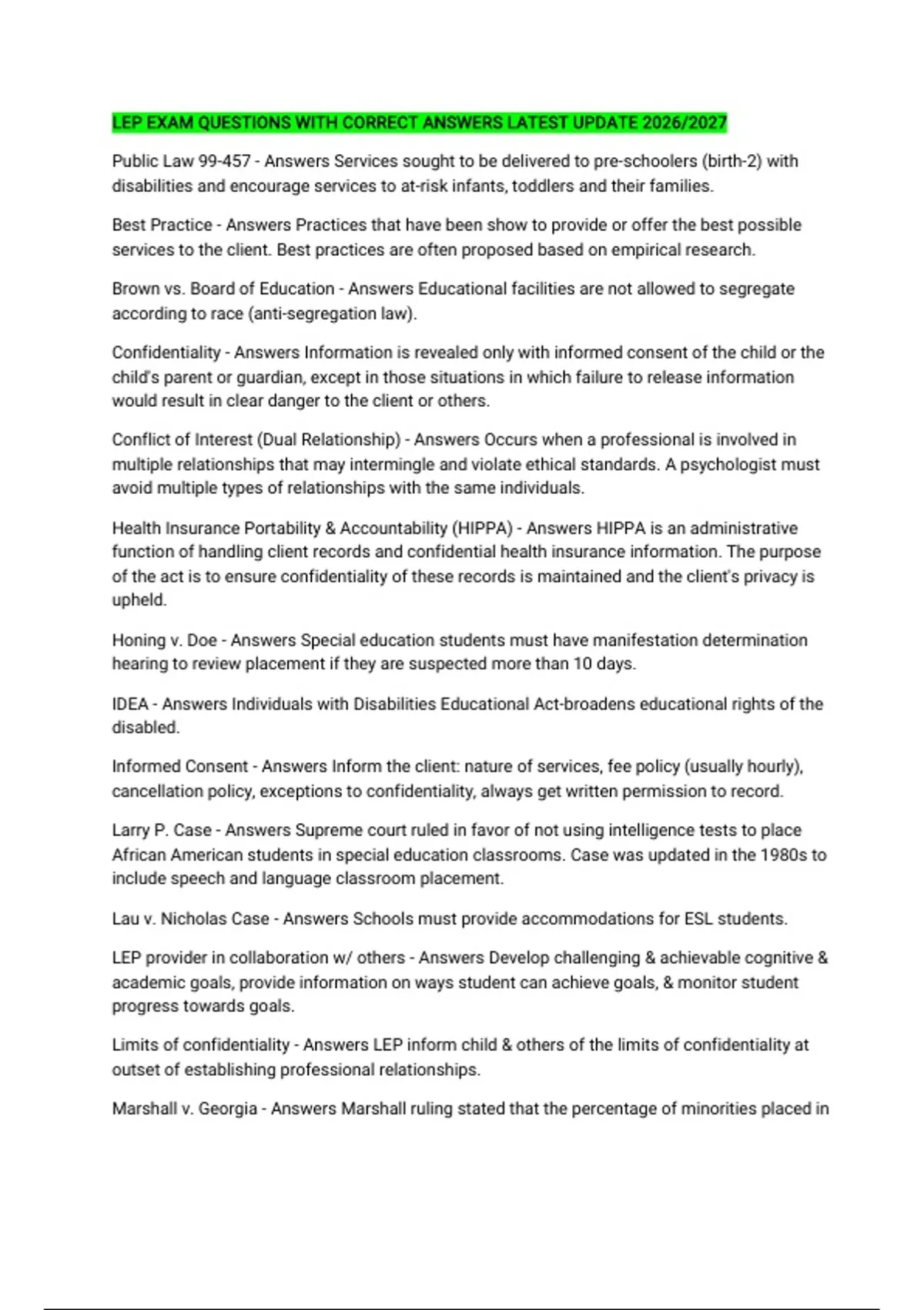 LEP EXAM QUESTIONS WITH CORRECT ANSWERS LATEST UPDATE 2026/2027 Public Law 99-457 - Answers Services sought to be delivered to pre-schoolers (birth-2) with disabilities and encourage services to at-risk infants, toddlers and their families. Best Practice - Answers Practices that have been show to provide or offer the best possible services to the client. Best practices are often proposed based on empirical research. Brown vs. Board of Education - Answers Educational facilities are not allowed to segregate according to race (anti-segregation law). Confidentiality - Answers Information is revealed only with informed consent of the child or the child's parent or guardian, except in those situations in which failure to release information would result in clear danger to the client or others. Conflict of Interest (Dual Relationship) - Answers Occurs when a professional is involved in multiple relationships that may intermingle and violate ethical standards. A psychologist must avoid multiple types of relationships with the same individuals. Health Insurance Portability & Accountability (HIPPA) - Answers HIPPA is an administrative function of handling client records and confidential health insurance information. The purpose of the act is to ensure confidentiality of these records is maintained and the client's privacy is upheld. Honing v. Doe - Answers Special education students must have manifestation determination hearing to review placement if they are suspected more than 10 days. IDEA - Answers Individuals with Disabilities Educational Act-broadens educational rights of the disabled. Informed Consent - Answers Inform the client: nature of services, fee policy (usually hourly), cancellation policy, exceptions to confidentiality, always get written permission to record. Larry P. Case - Answers Supreme court ruled in favor of not using intelligence tests to place African American students in special education classrooms. Case was updated in the 1980s to include speech and language classroom placement. Lau v. Nicholas Case - Answers Schools must provide accommodations for ESL students. LEP provider in collaboration w/ others - Answers Develop challenging & achievable cognitive & academic goals, provide information on ways student can achieve goals, & monitor student progress towards goals. Limits of confidentiality - Answers LEP inform child & others of the limits of confidentiality at outset of establishing professional relationships. Marshall v. Georgia - Answers Marshall ruling stated that the percentage of minorities placed in special education can exceed the percentage in the representative population as long as the appropriate and proper steps for placement were followed. Necessity of License (Unauthorized representation as a licensee) - Answers It is unlawful for any person to practice educational psychology or use any title or letters that imply that he is a licensed educational psychologist unless, at the time of so doing, he holds a valid, unexpired, and unrevoked license. Perkins Act - Answers Gives rights to transition special education students in vocational problems -occupational access. Privacy & Confidentiality - Answers 1. Privacy refers to the immediate surrounding. 2. Confidentiality extends beyond the session & refers to the promise the therapist makes with the client that things discussed during a session will not be repeated. Public Law 94-457 - Answers Education of the handicapped authorized early intervention of toddlers and families.