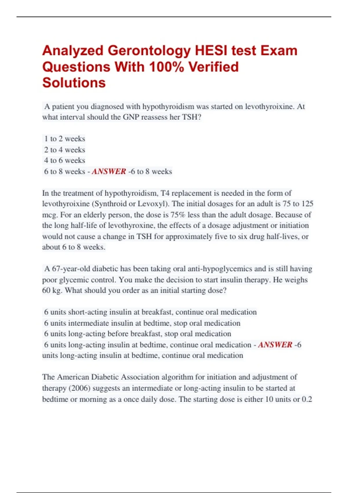 Analyzed Gerontology HESI test Exam Questions With 100% Verified Solutions A patient you diagnosed with hypothyroidism was started on levothyroixine. At what interval should the GNP reassess her TSH? 1 to 2 weeks 2 to 4 weeks 4 to 6 weeks 6 to 8 weeks - ANSWER -6 to 8 weeks In the treatment of hypothyroidism, T4 replacement is needed in the form of levothyroixine (Synthroid or Levoxyl). The initial dosages for an adult is 75 to 125 mcg. For an elderly person, the dose is 75% less than the adult dosage. Because of the long half-life of levothyroxine, the effects of a dosage adjustment or initiation would not cause a change in TSH for approximately five to six drug half-lives, or about 6 to 8 weeks. A 67-year-old diabetic has been taking oral anti-hypoglycemics and is still having poor glycemic control. You make the decision to start insulin therapy. He weighs 60 kg. What should you order as an initial starting dose? 6 units short-acting insulin at breakfast, continue oral medication 6 units intermediate insulin at bedtime, stop oral medication 6 units long-acting before breakfast, stop oral medication 6 units long-acting insulin at bedtime, continue oral medication - ANSWER -6 units long-acting insulin at bedtime, continue oral medication The American Diabetic Association algorithm for initiation and adjustment of therapy (2006) suggests an intermediate or long-acting insulin to be started at bedtime or morning as a once daily dose. The starting dose is either 10 units or 0.2 units per kilogram. Oral medication should be continued except for discontinuing sulfonylureas or meglitinides. A 65 year patient has sub-occipital and posterior cranial head pain following a fall. The GNP conducts a musculoskeletal assessment by: Palpating the acromioclavicular joint. Assessing the gleno-humeral range of motion. Palpating the cervical vertebrae. Palpating anterior the thoracic muscles. - ANSWER -Palpating the cervical vertebrae. The patient who is complaining of sub-occipital, posterior head pain should have the cervical vertebrae assessed. Additionally, the GNP will palpate the posterior neck muscles and assess the neck for range of motion. A 67-year-old female is in the office with cataracts. She is asking what she needs to do about this. The GNP understands that all of the following are management for this except: Surgery may be necessary if the cataract markedly decreases visual acuity. No drugs are available that will halt the progression of the aging process of the eye. Vision correction with corrective lenses are available if the cataracts are in the early stages. Ophthalmic steroids that decrease the severity are available by prescription from an ophthalmologist. - ANSWER -Ophthalmic steroids that decrease the severity are available by prescription from an ophthalmologist. No topical or oral medications exists that will cure or treat this condition. However, there are surgical options. You are providing patient education to a patient who has recently been diagnosed with shingles. Which of the following is NOT true of the way this patient should care for his rash? He should leave the rash uncovered to speed healing. He should keep the rash covered. He should keep the rash clean and dry. He should use only nonadhesive bandages on the rash. - ANSWER -He should leave the rash uncovered to speed healing. Patients with herpes zoster - shingles - should keep their rashes clean, dry, and covered. The adhesive in bandages can irritate the shingles, so only nonadhesive bandages should be used. You are providing care for a patient who has been admitted to the hospital after a fall. Which of the following is NOT appropriate when providing patient education for when the patient returns home? The patient should resume regular activities as soon as possible. The patient should avoid returning to full activity until he is fully recovered. The patient should take extra care of his feet. The patient should engage in some type of regular exercise. - ANSWER -The patient should avoid returning to full activity until he is fully recovered. Patients who have suffered a fall should return to normal activity as soon as possible. Avoiding routine activities may increase fear of falling and actually increase the risk of falling. Regular exercise and foot care can also help reduce the risk of falls. Which of the following is true when performing a functional assessment with a geriatric patient? It may be necessary to allow more time for the assessment if the patient has impaired mobility. It is not necessary to perform the assessment if the patient uses a wheelchair. It may be necessary to bring in someone to assist the patient with the assessment.
