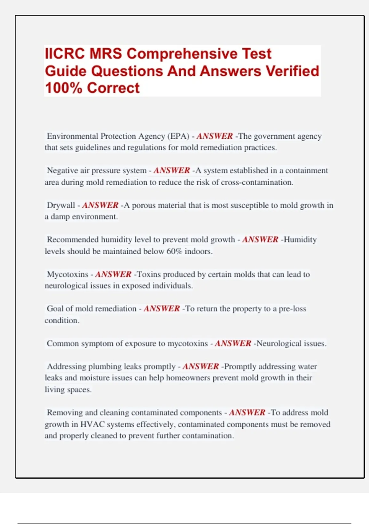 Goal of mold remediation - ANSWER -To return the property to a pre-loss