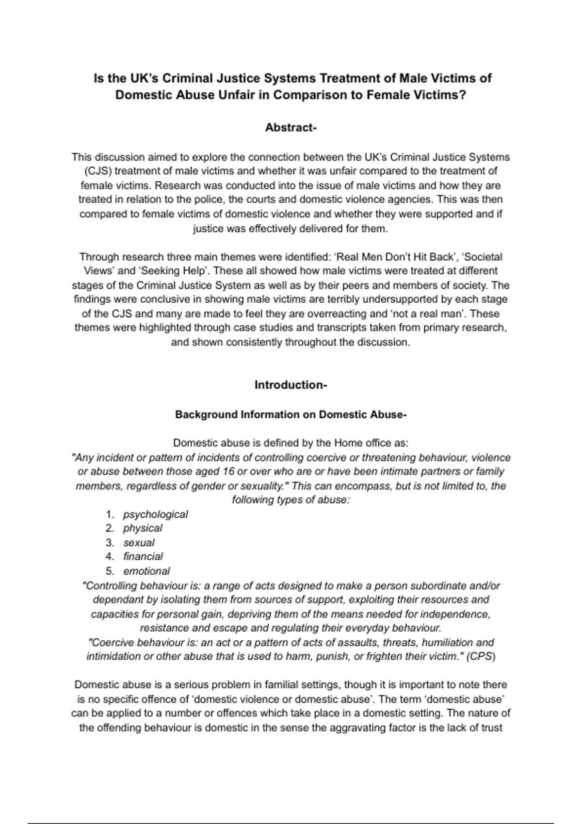My interest in domestic abuse, specifically how male victims are treated in comparison to