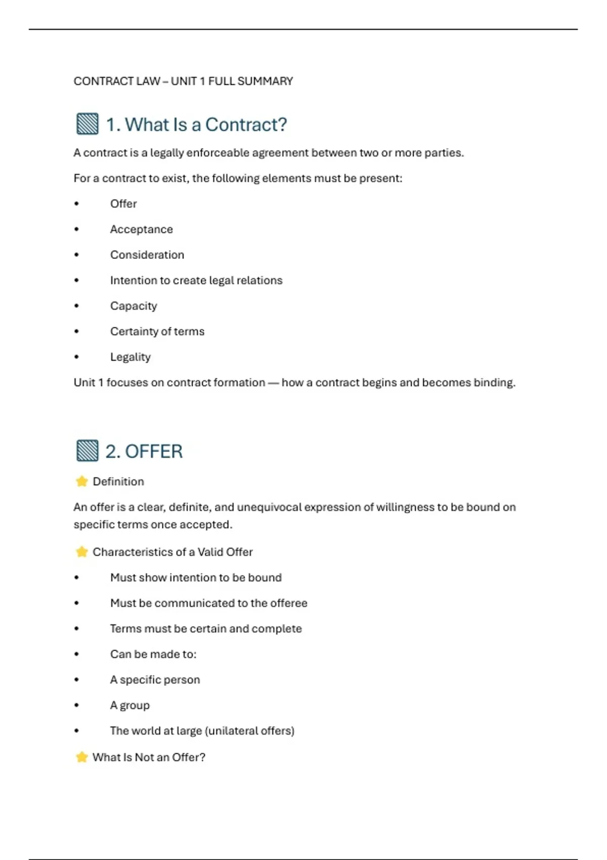 This document provides a complete, detailed, and exam‑ready summary of Harvard edX Contract Law – Unit 1. It covers all essential concepts, principles, and rules introduced in the first unit of the course, explained in clear and simple language that is easy for students to understand. The notes include structured explanations, key definitions, practical examples, and case‑based insights that help students grasp the foundations of contract formation, offer and acceptance, consideration, enforceability, and related doctrines. Designed for first‑year/introductory law students, these notes are perfect for quick revision, assignment preparation, and building a strong foundation in Contract Law. This document is ideal for students who want: • A complete and well‑organised summary of Unit 1 • Clear explanations of core Contract Law concepts • A reliable guide for exam preparation • A fast and effective way to revise the Harvard edX material Perfect for preparing for end‑of‑semester Contract Law exams or strengthening your understanding of foundational contract principles.