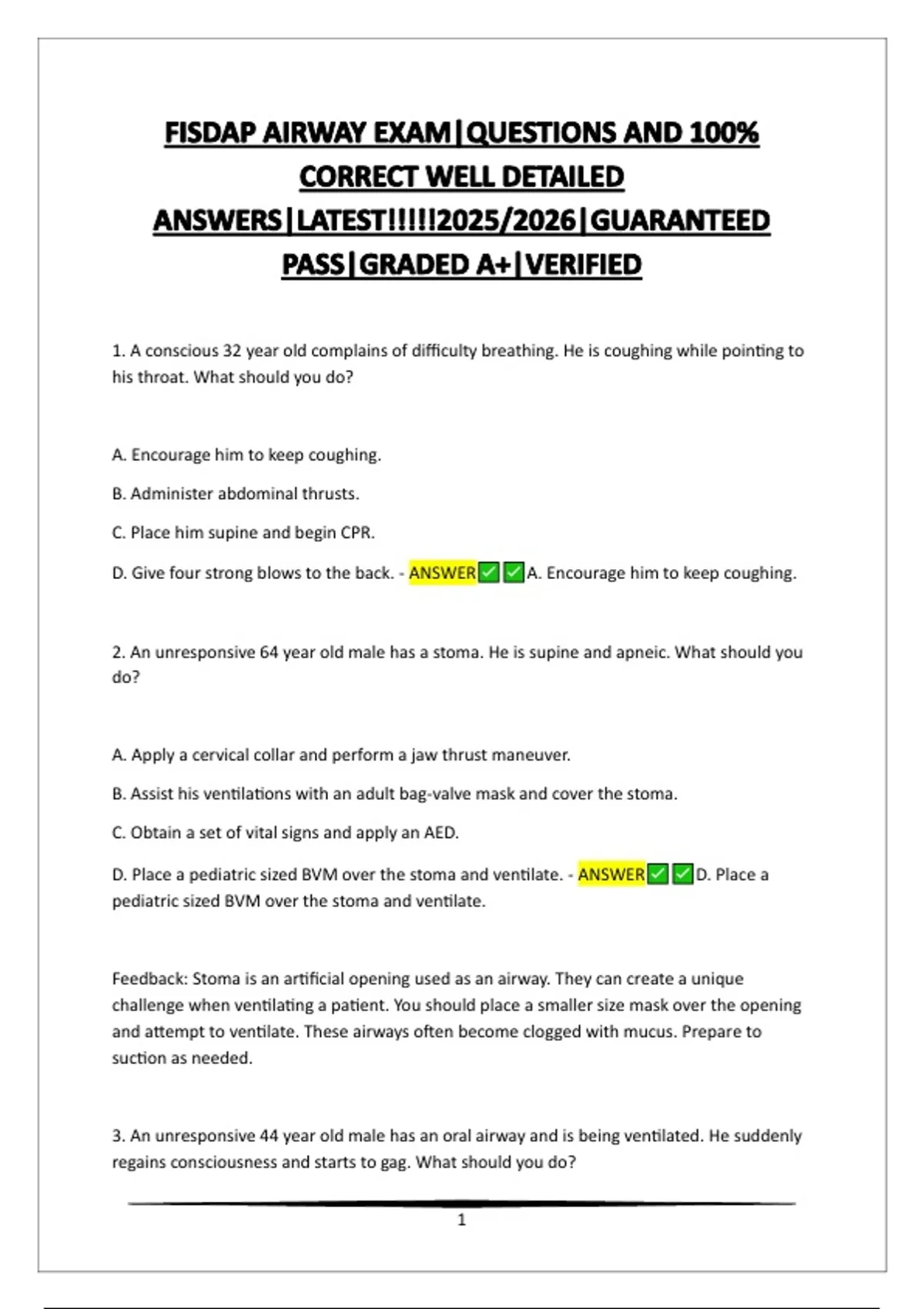 1. A conscious 32 year old complains of difficulty breathing. He is coughing while pointing to