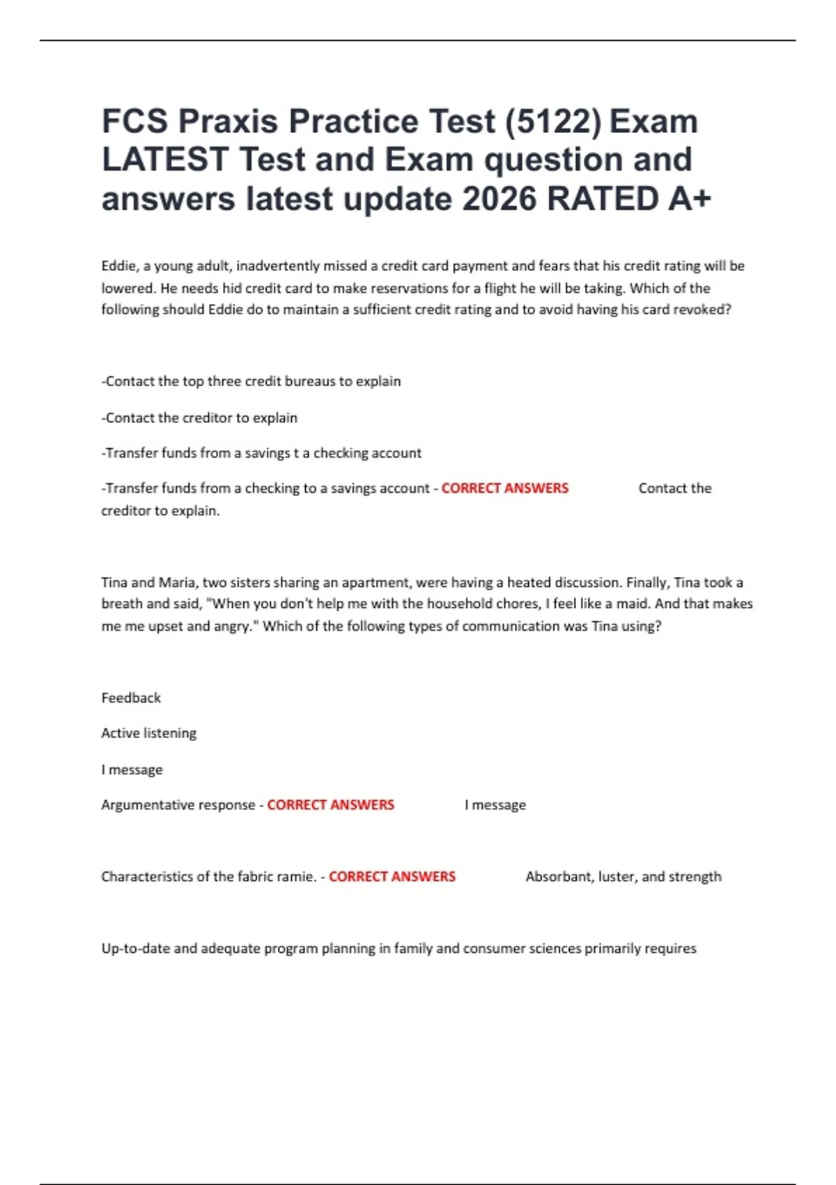 FCS Praxis Practice Test (5122) Exam LATEST Test and Exam question and answers latest update 2026 RATED A+