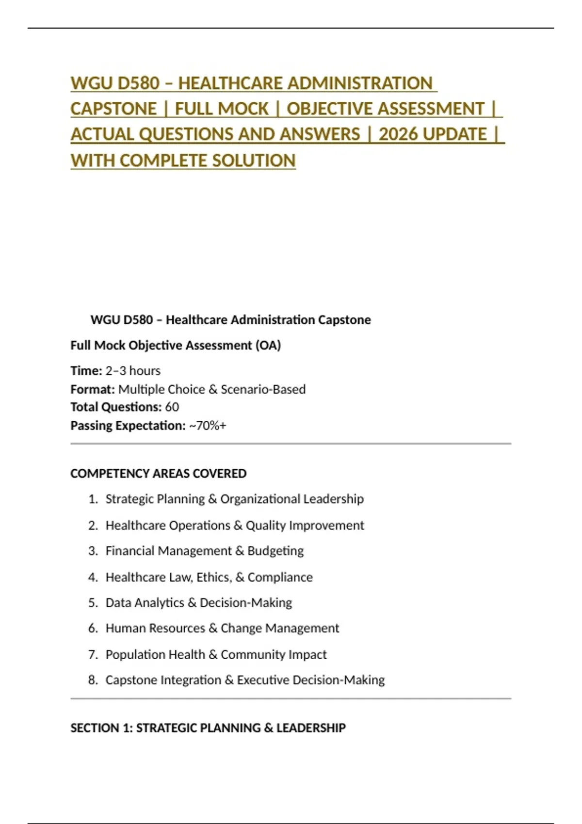 WGU D580 – HEALTHCARE ADMINISTRATION CAPSTONE | FULL MOCK | OBJECTIVE ASSESSMENT | ACTUAL QUESTIONS AND ANSWERS | 2026 UPDATE | WITH COMPLETE SOLUTION