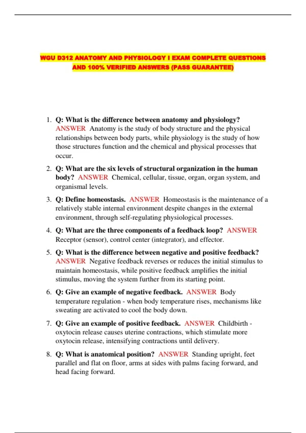 WGU D312 ANATOMY AND PHYSIOLOGY I EXAM COMPLETE QUESTIONS AND 100% VERIFIED ANSWERS (PASS GUARANTEE)