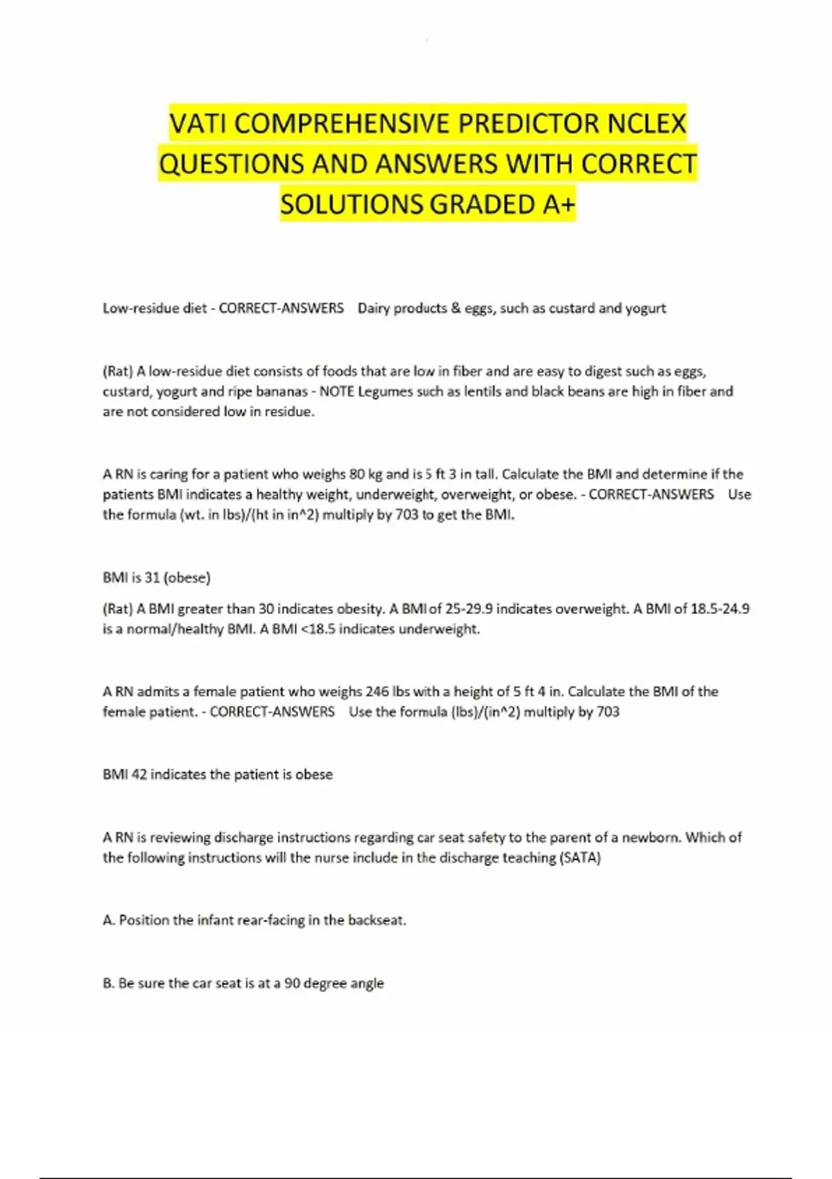VATI COMPREHENSIVE PREDICTOR NCLEX QUESTIONS AND ANSWERS WITH CORRECT SOLUTIONS GRADED A+ Low-residue diet - CORRECT-ANSWERS Dairy products & eggs, such as custard and yogurt (Rat) A low-residue diet consists of foods that are low in fiber and are easy to digest such as eggs, custard, yogurt and ripe bananas - NOTE Legumes such as lentils and black beans are high in fiber and are not considered low in residue. A RN is caring for a patient who weighs 80 kg and is 5 ft 3 in tall. Calculate the BMI and determine if the patients BMI indicates a healthy weight, underweight, overweight, or obese. - CORRECT-ANSWERS Use the formula (wt. in lbs)/(ht in in^2) multiply by 703 to get the BMI. BMI is 31 (obese) (Rat) A BMI greater than 30 indicates obesity. A BMI of 25-29.9 indicates overweight. A BMI of 18.5-24.9 is a normal/healthy BMI. A BMI <18.5 indicates underweight.