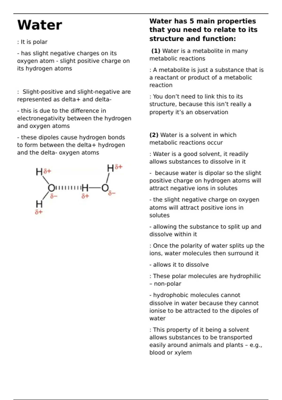 This is a Word document of my summary/notes on AQA Paper 1 Biological molecules - 3.1.7 Water. It is formatted in two columns and includes diagrams.