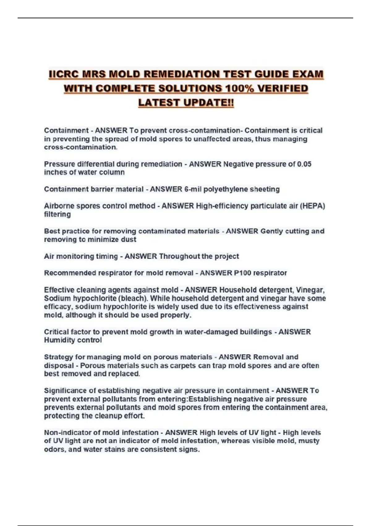 IICRC MRS MOLD REMEDIATION TEST GUIDE EXAM WITH COMPLETE SOLUTIONS 100% VERIFIED LATEST UPDATE!!