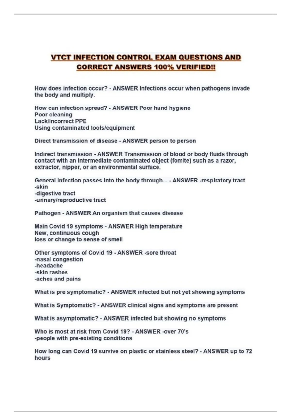 VTCT INFECTION CONTROL EXAM QUESTIONS AND CORRECT ANSWERS 100% VERIFIED!!...