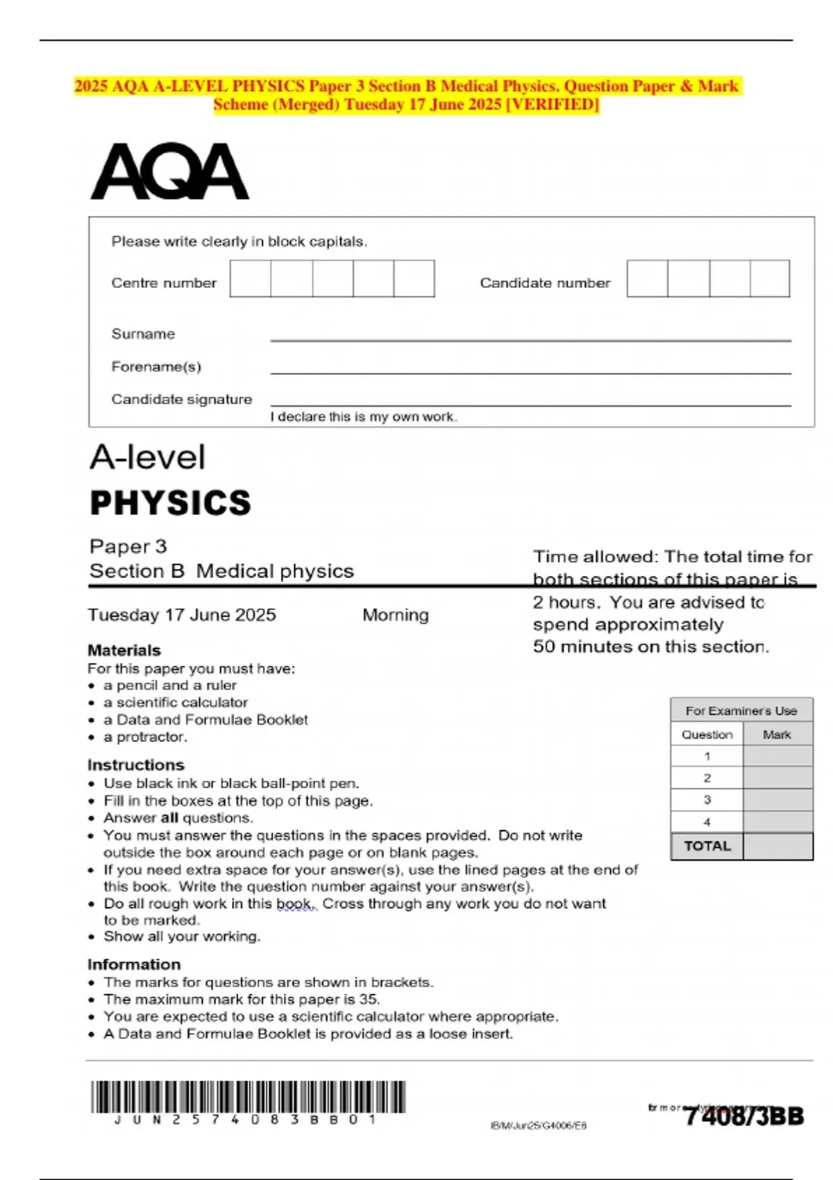2025 AQA A-LEVEL PHYSICS Paper 3 Section B Medical Physics. Question Paper & Mark Scheme (Merged) Tuesday 17 June 2025 [VERIFIED]