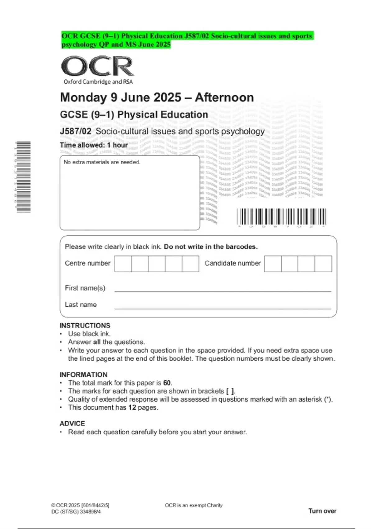 OCR GCSE (9–1) Physical Education J587/02 Socio-cultural issues and sports psychology QP and MS June 2025