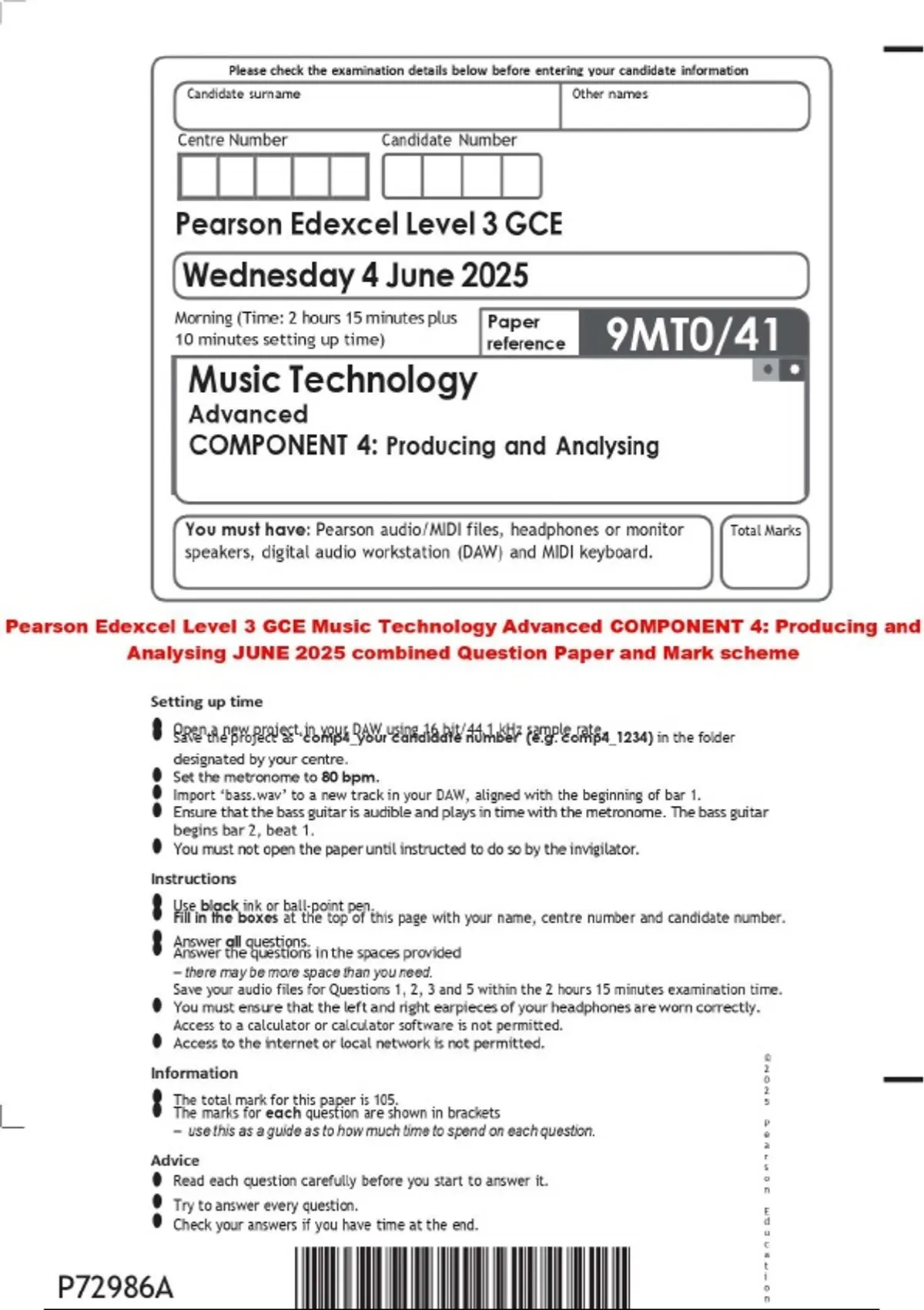 Pearson Edexcel Level 3 GCE Music Technology Advanced COMPONENT 4: Producing and Analysing JUNE 2025 combined Question Paper and Mark scheme