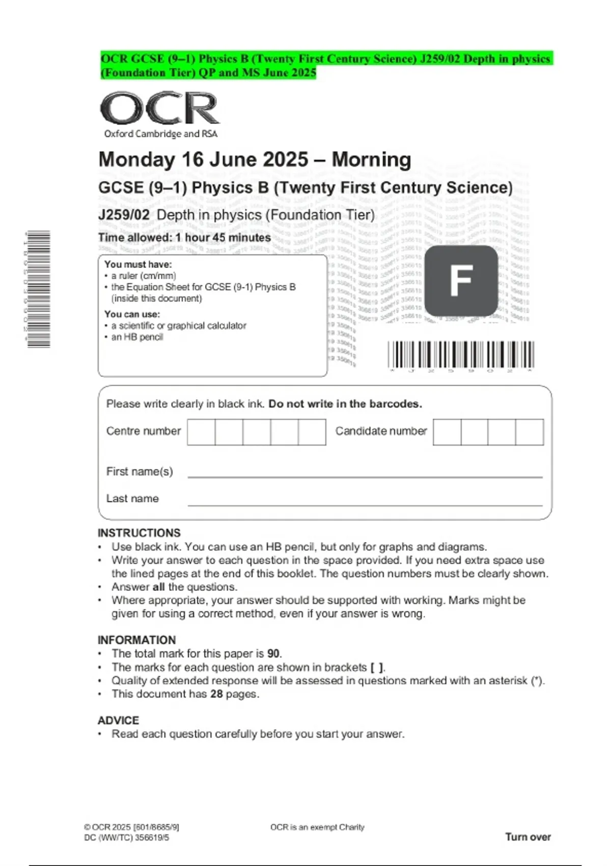 OCR GCSE (9–1) Physics B (Twenty First Century Science) J259/02 Depth in physics (Foundation Tier) QP and MS June 2025