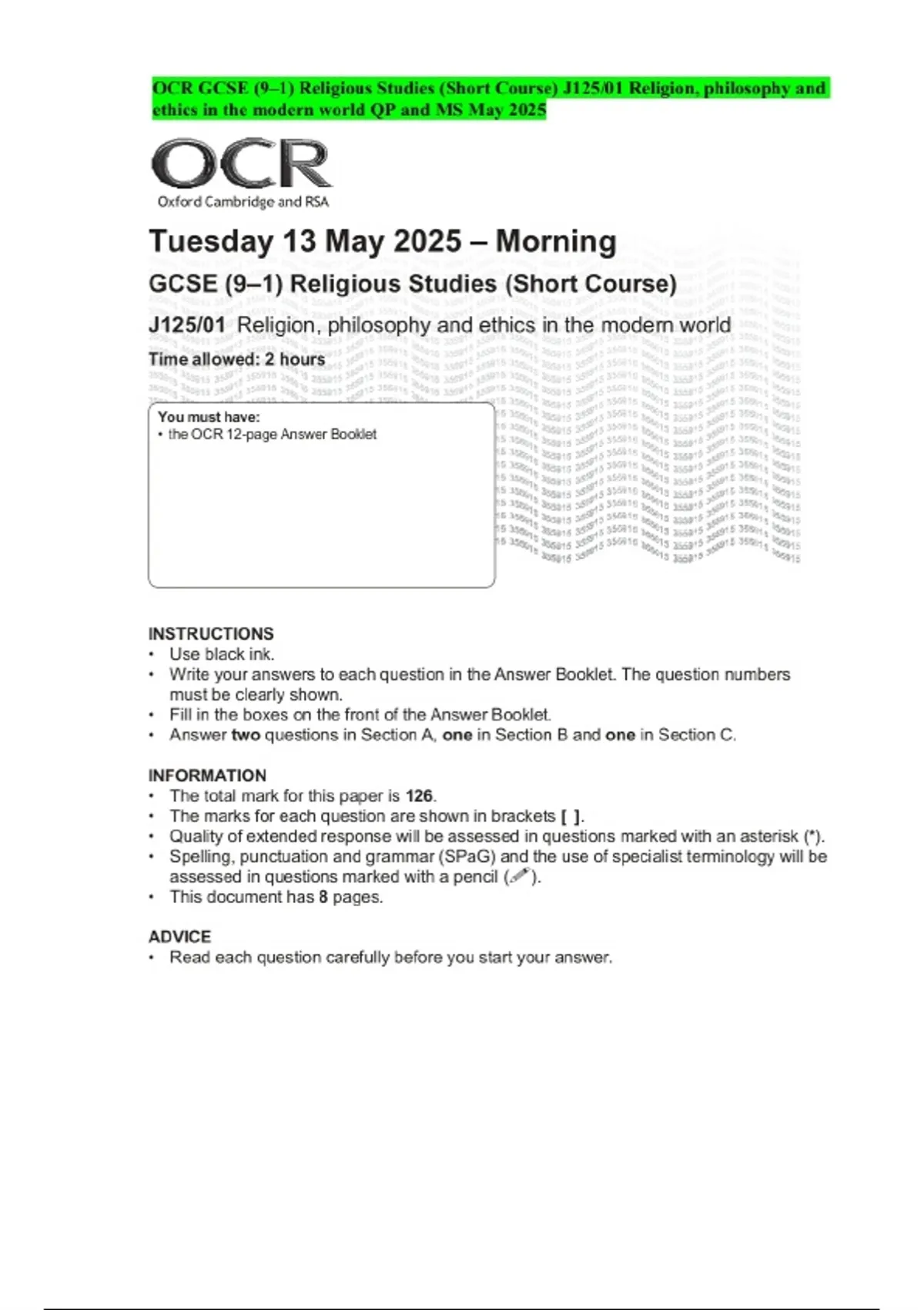 OCR GCSE (9–1) Religious Studies (Short Course) J125/01 Religion, philosophy and ethics in the modern world QP and MS May 2025