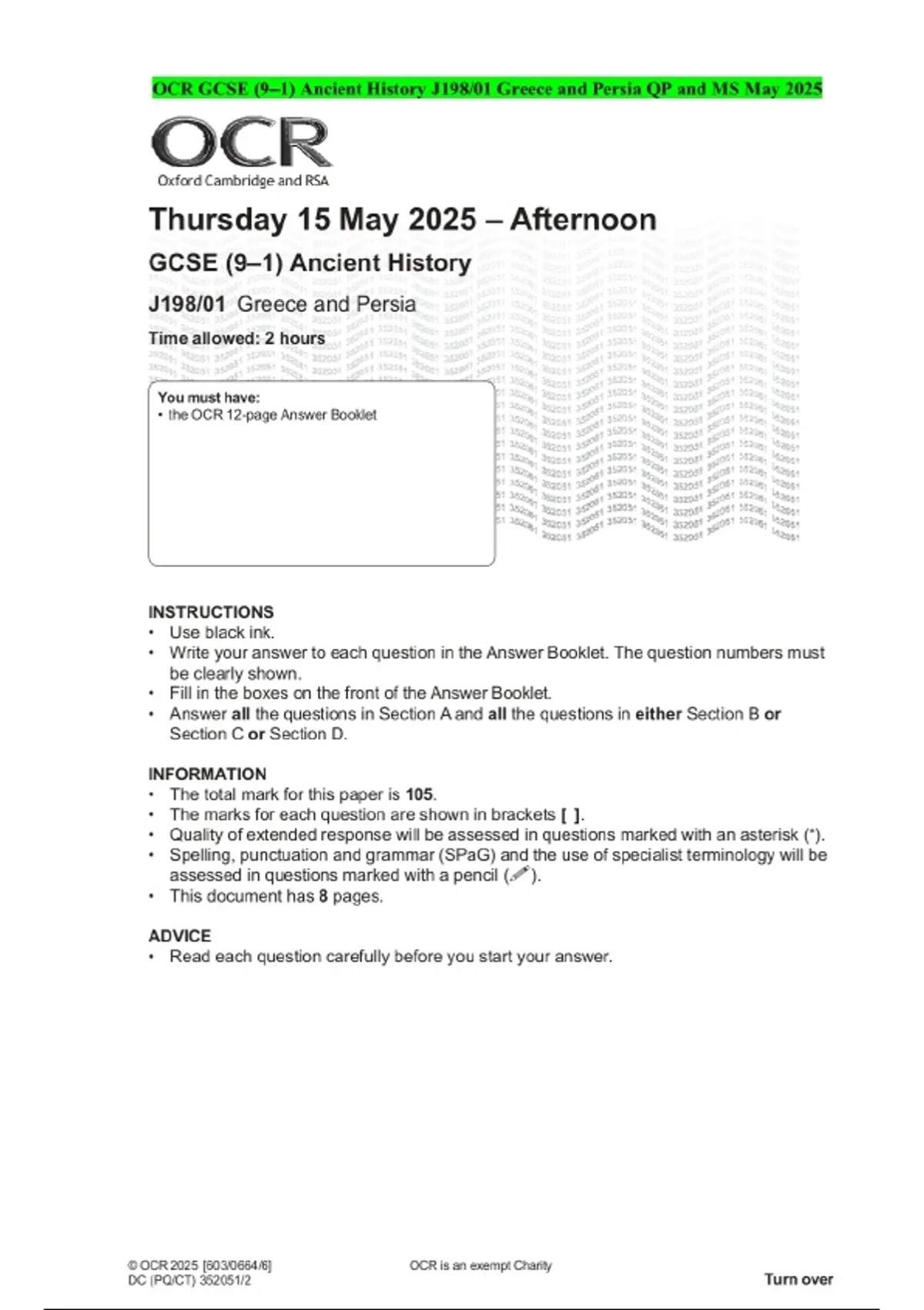 OCR GCSE (9–1) Ancient History J198/01 Greece and Persia QP and MS May 2025