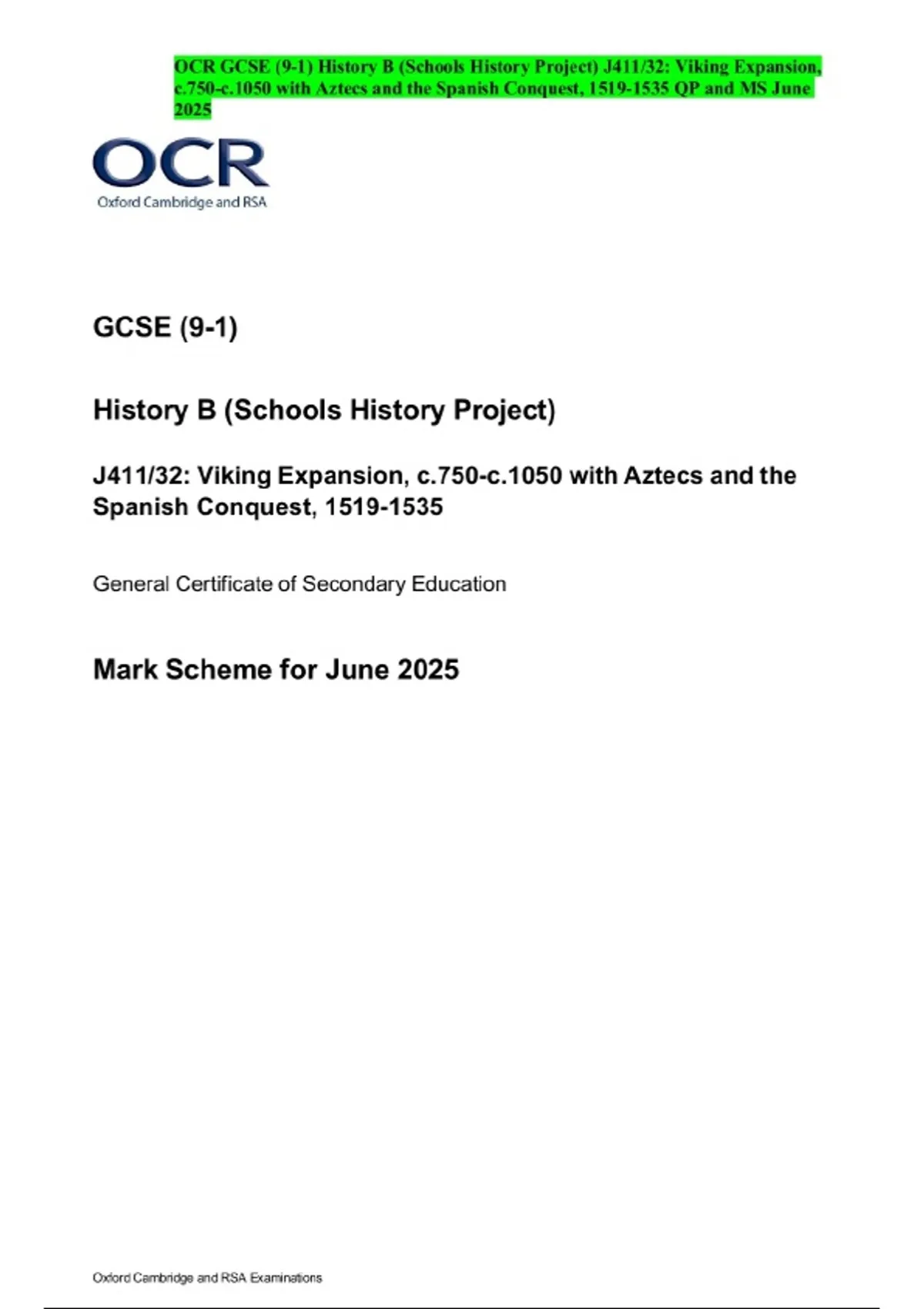 OCR GCSE (9-1) History B (Schools History Project) J411/32: Viking Expansion, c.750-c.1050 with Aztecs and the Spanish Conquest, QP and MS June 2025