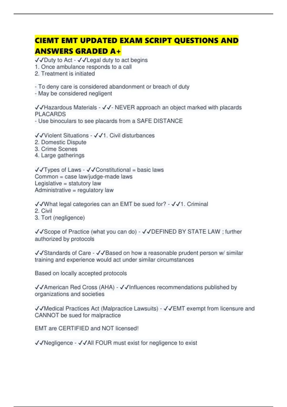 CIEMT EMT UPDATED EXAM SCRIPT QUESTIONS AND ANSWERS GRADED A+