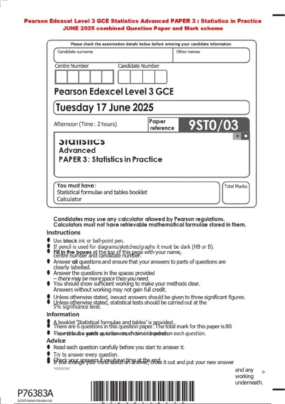 Pearson Edexcel Level 3 GCE Statistics Advanced PAPER 3 : Statistics in Practice JUNE 2025 combined Question Paper and Mark scheme