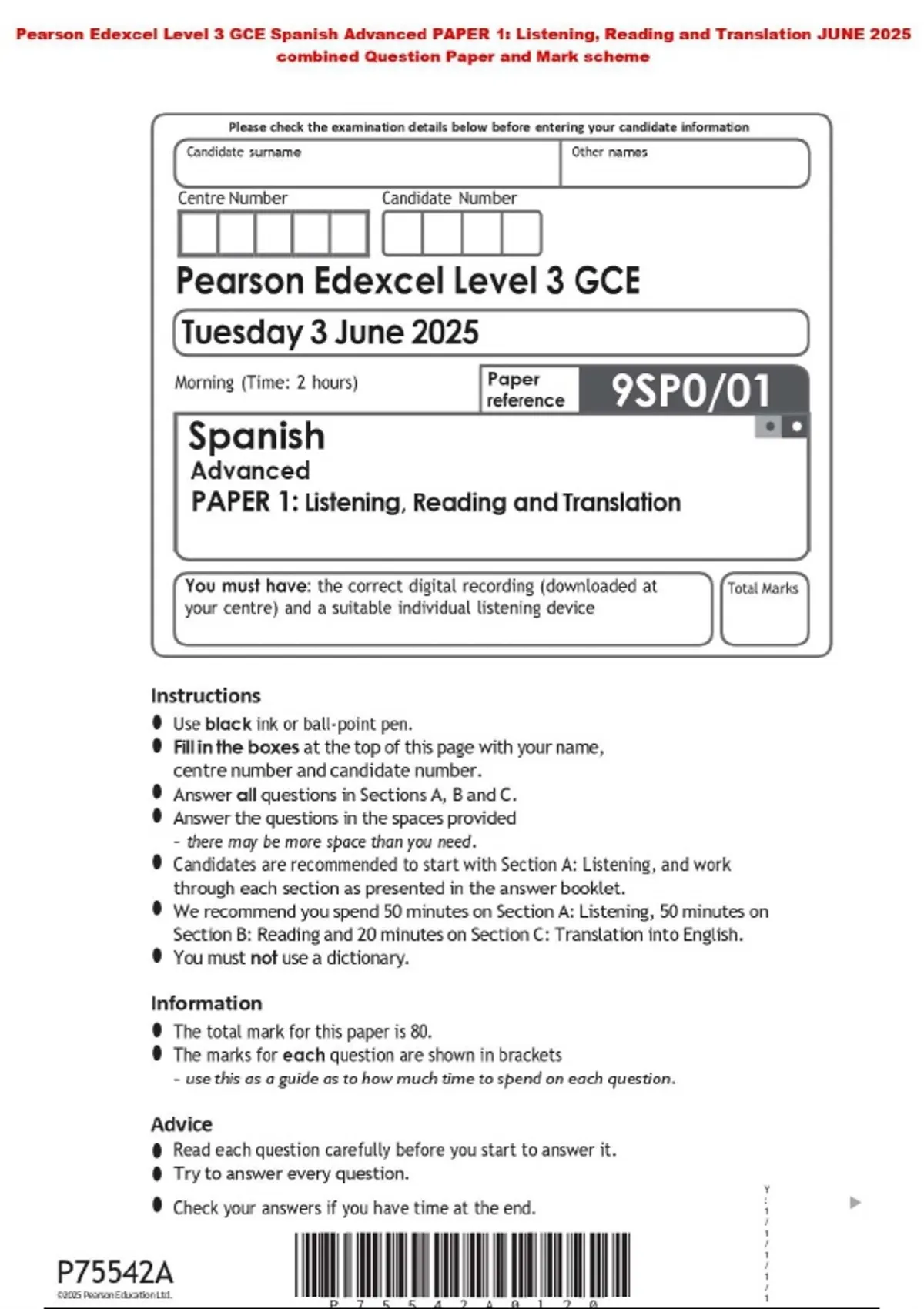 Pearson Edexcel Level 3 GCE Spanish Advanced PAPER 1: Listening, Reading and Translation JUNE 2025 combined Question Paper and Mark scheme