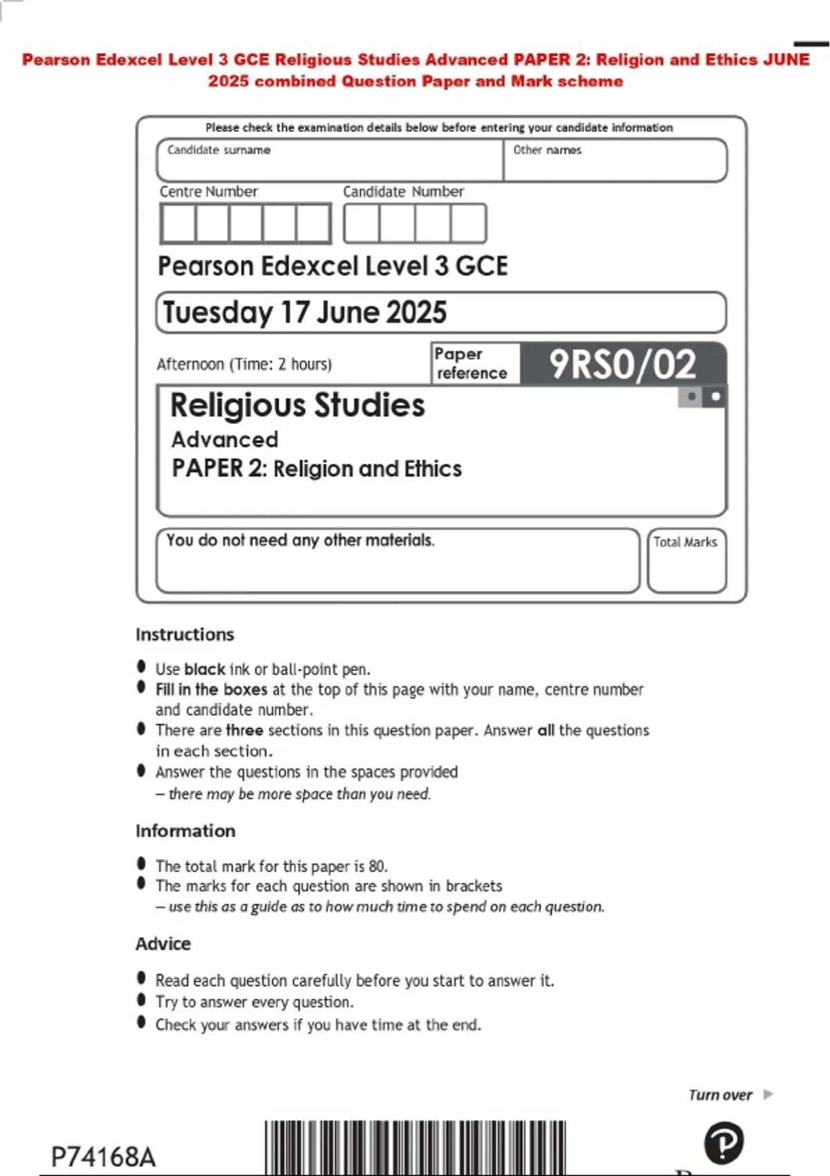 Pearson Edexcel Level 3 GCE Religious Studies Advanced PAPER 2: Religion and Ethics JUNE 2025 combined Question Paper and Mark scheme